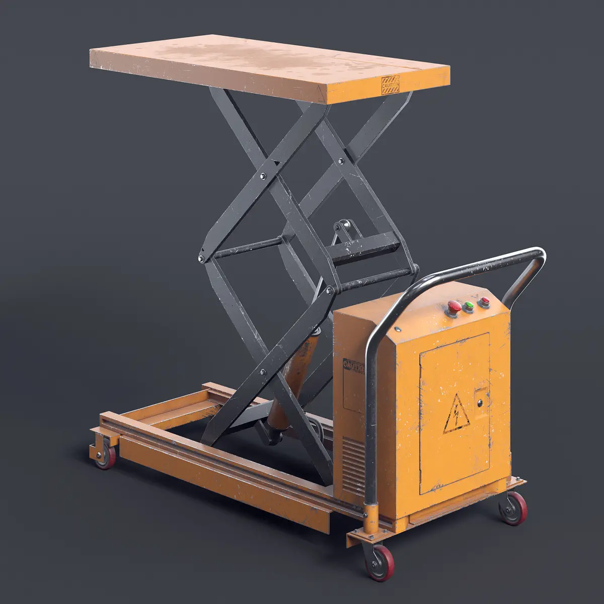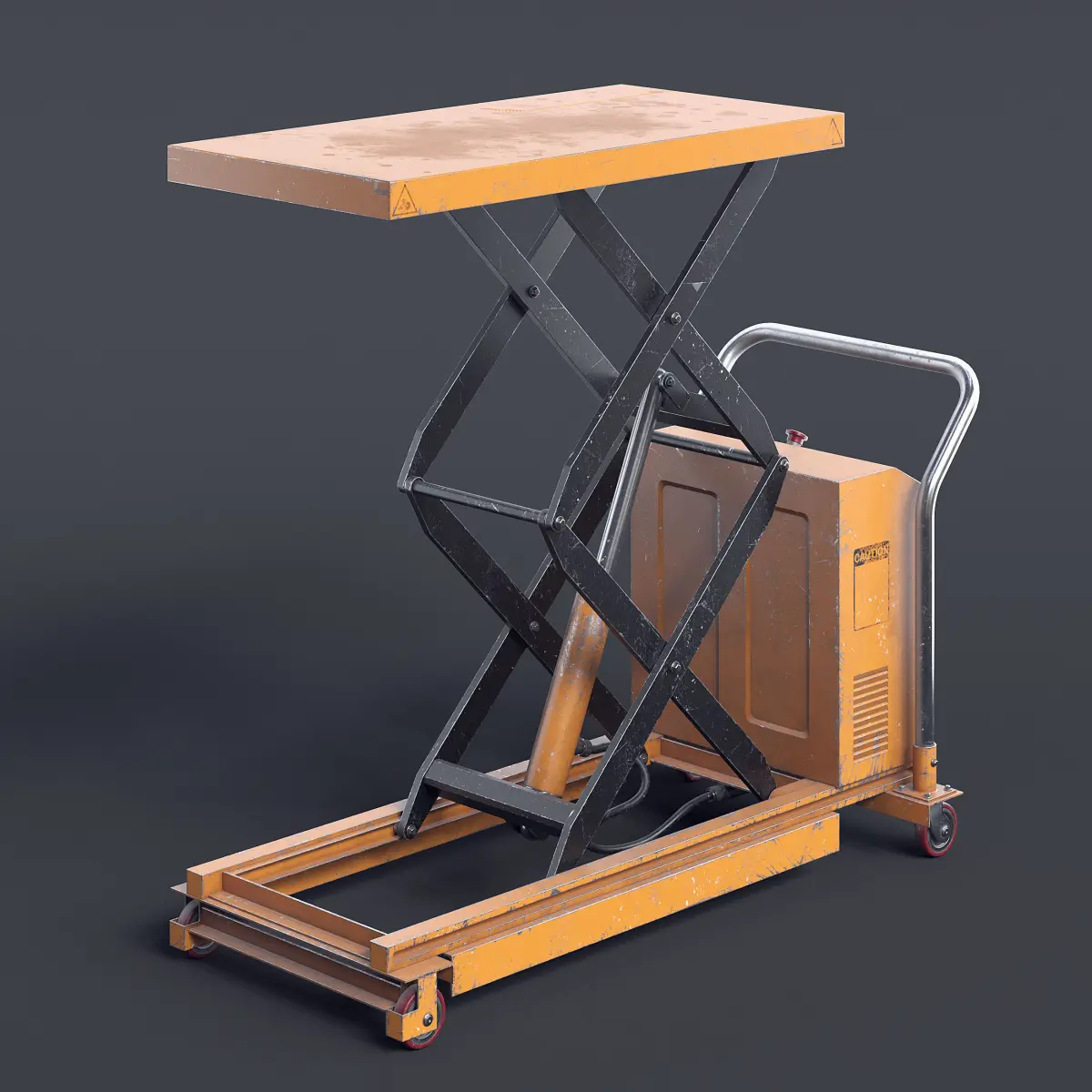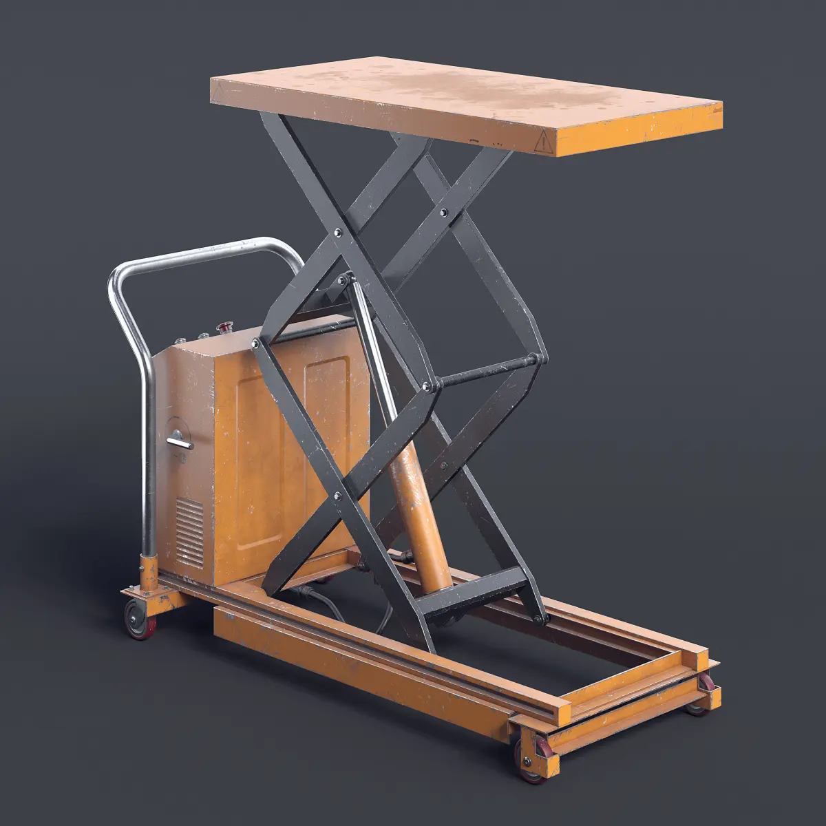 Orange-black electric scissor lift table.