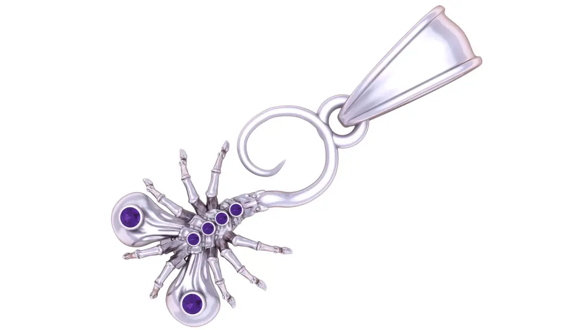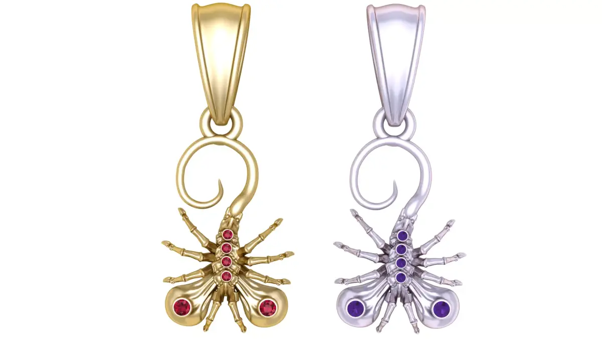This elegant gold pendant features a meticulously crafted scorpion design, symbolizing strength, protection, and resilience. The scorpion’s body is highlighted with brilliant red gemstones, adding a striking contrast to the golden base. Its curled tail and detailed legs bring out a lifelike yet artistic charm, making it a bold statement piece for jewelry lovers.