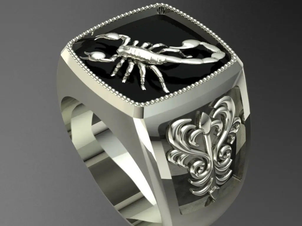 Introducing the stunning signet ring design for men, featuring a striking scorpion emblem on the top. This unique ring design is perfect for those who love to express their individuality and style through their accessories.
