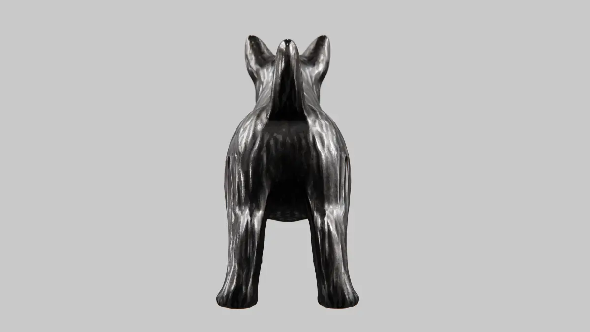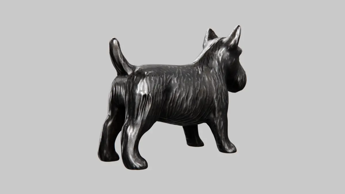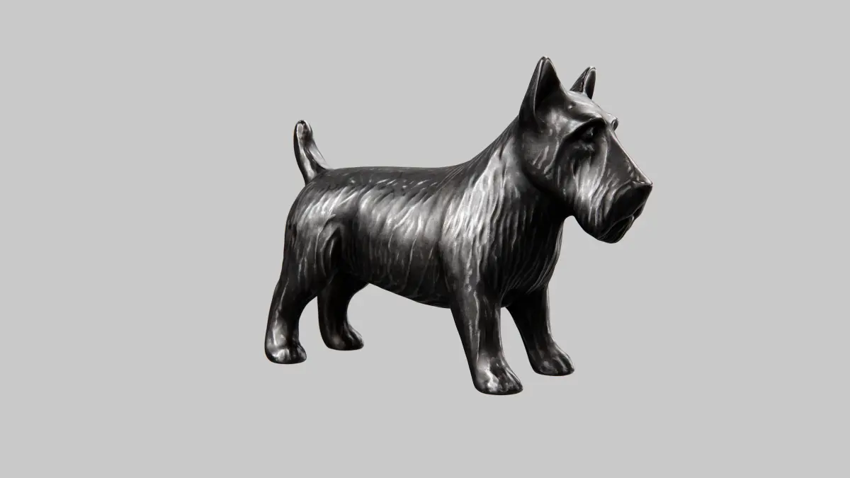 This is a 3D model of a Scottish Terrier (Scottie) dog statuette, featuring a textured finish of aged metal. The model has quad topology, is fully UVW mapped, and includes 8K texture maps. It is suitable for interior visualization and decorative purposes. Multiple file formats are provided: .max, .obj, .fbx, .abc, and more.