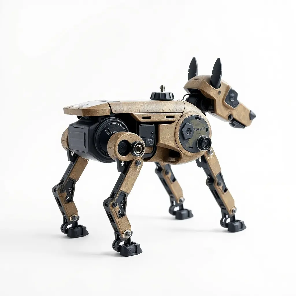 The Scout Robot Dog is designed with map-building sensors and hidden compartments, featuring a stealthy metallic surface under composite camouflage. This versatile model is ideal for futuristic simulations, tactical role-playing games, and educational purposes related to robotics and AI technology.