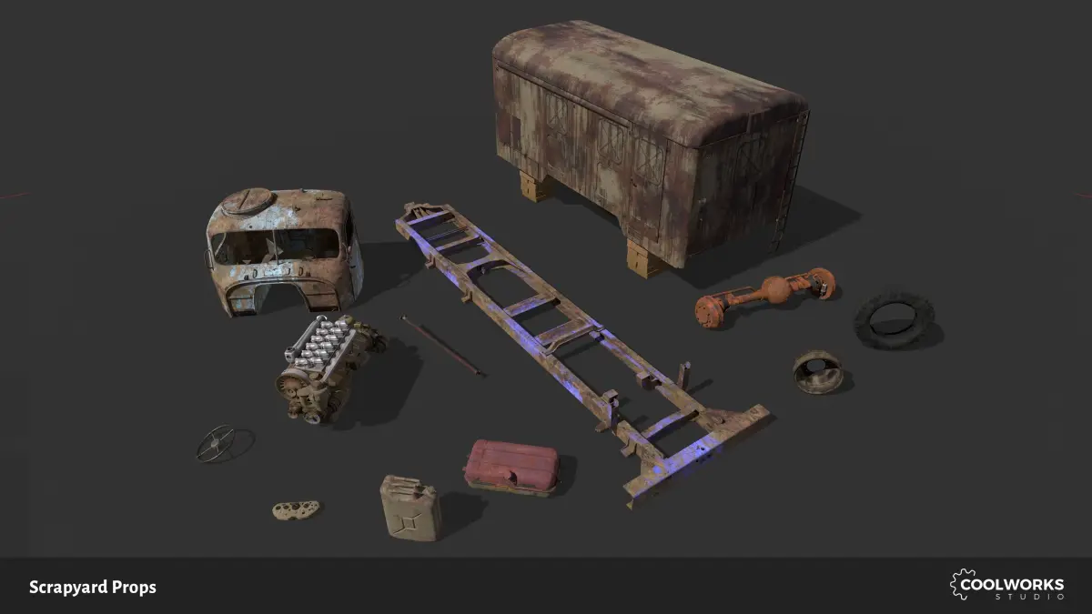 Set of various scrap and rusty truck components, ideal for any game environment. All assets are PBR ready.