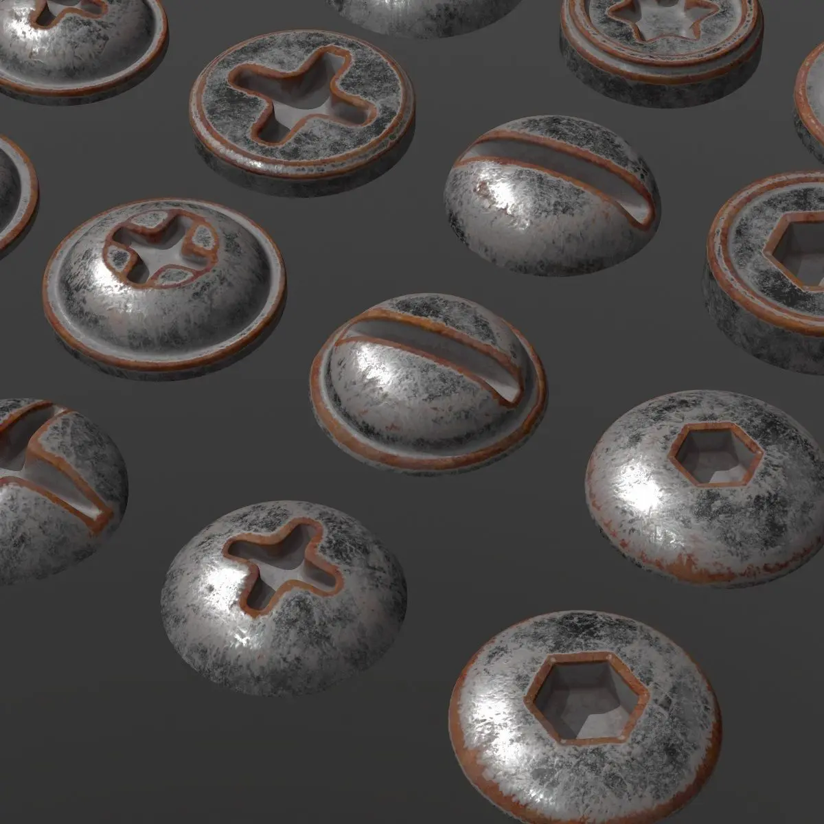 Several kinds of screw heads for hard surface modeling. Philips, flat, hex, and torx screw heads included. These are also great for baking normal maps.