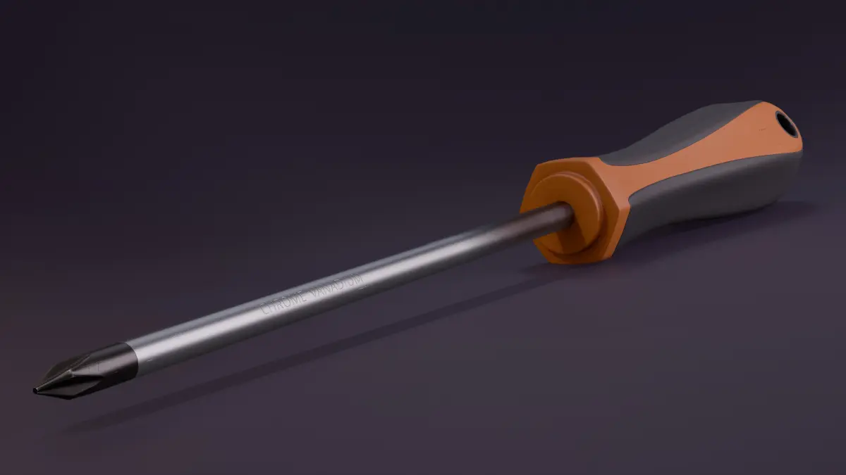 A Realistic 3D model of a screwdriver with a comfortable dual-material handle (plastic and rubber grip) and a Phillips head (cross-head) with a magnetic tip.