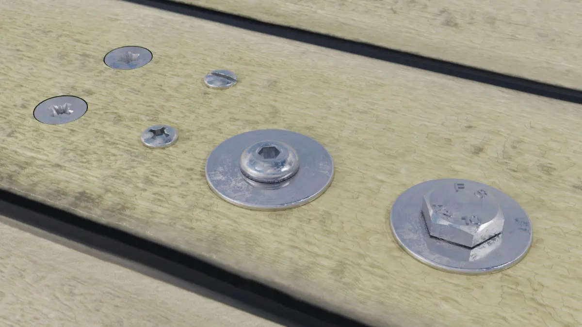 Here are multiple models and variations od screws, bolts and nuts with different heads and threads. They have a realistic procedural metal material.