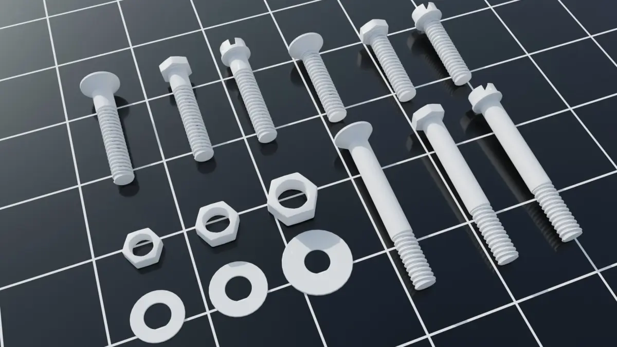 Set of realistic 3D models of 9 different screws, 3 nuts and 3 washers all modeled in Blender with materials