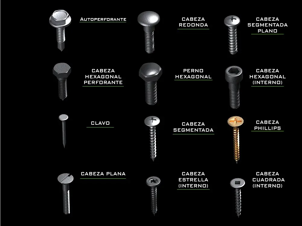 -Cabeza Phillips-cabeza Segmentada-Cabeza Segmentada punta plana-tornillo Autoperforante-Cabeza Hexagonal-Cabeza Hexagonal Perforante-Cabeza de Estrella(interno)-Cabeza cuadrada(interno)-Clavos-Cabeza Plana-Cabeza Segmentada Punta Fina-Cabeza Hexagonal (interno) Para llave Allen