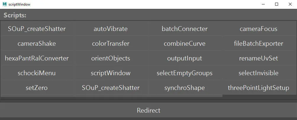 By running this script it asks you to give a directory with mel and python scripts and he will create a window with buttons named after those scripts so you can easily run just by clicking one of them.