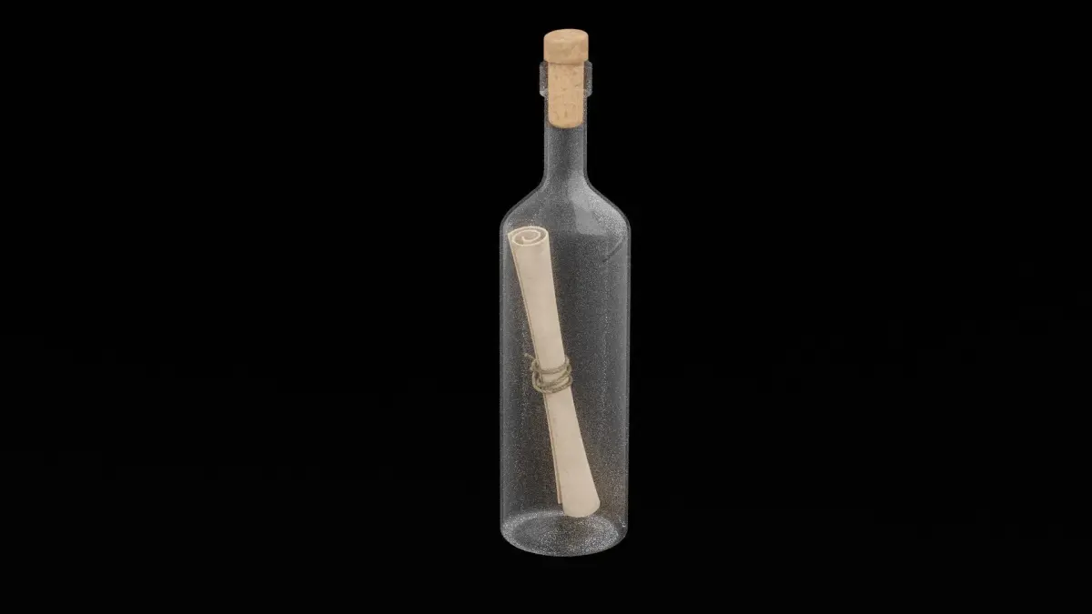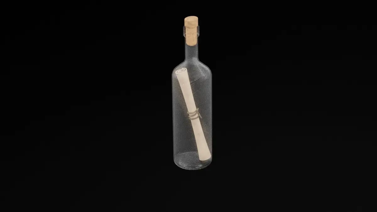 Description: This model features an ancient scroll sealed inside a transparent glass bottle, evoking the mystery of a message lost at sea. The glass bottle has a slightly curved shape, with a narrow neck and a cork stopper. Its surface is detailed with light scratches and faint condensation marks for added realism. The scroll inside is carefully rolled, its edges aged and slightly frayed, with faint writing visible through the bottle. The cork stopper appears weathered and has subtle imperfections. A wax seal on the outside of the bottle adds a touch of authenticity and historical charm. Ideal for pirate-themed environments, treasure hunts, or fantasy narratives.