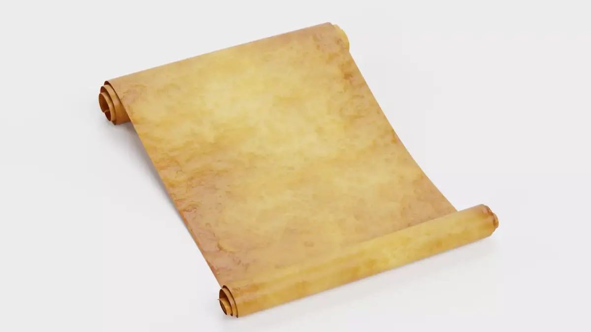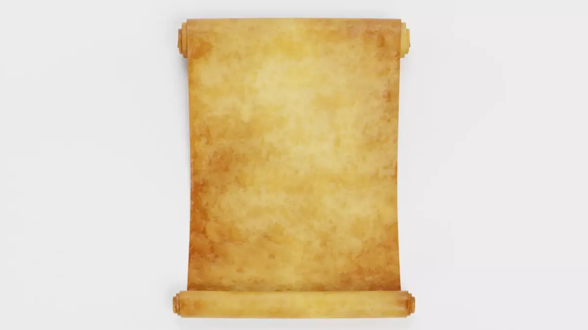 A 3D scroll model featuring an aged, slightly curled paper sheet with subtle folds, edge irregularities, and warm parchment coloration. This version focuses on the natural paper form, resembling a loose medieval document or royal decree ready for sealing or display. The texture combines vintage paper tones and surface wear, achieving a convincing aged parchment look suitable for historical or fantasy-themed assets.