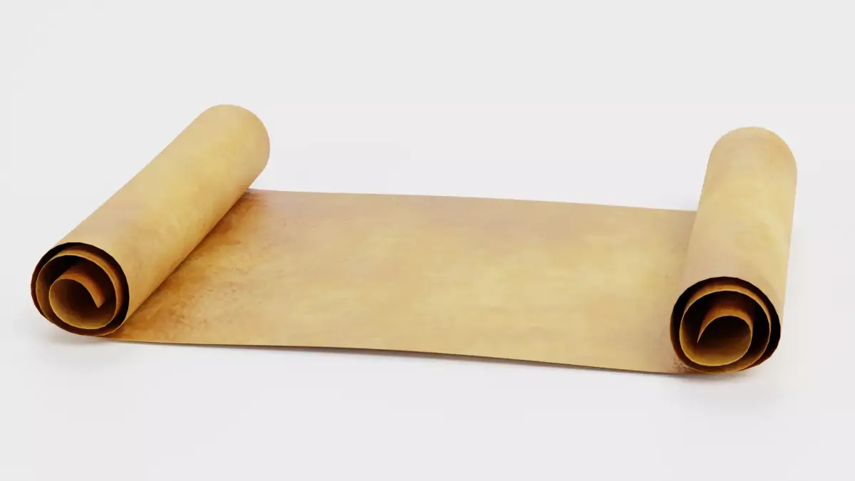 A 3D scroll model featuring an aged, slightly curled paper sheet with subtle folds, edge irregularities, and warm parchment coloration. This version focuses on the natural paper form, resembling a loose medieval document or royal decree ready for sealing or display. The texture combines vintage paper tones and surface wear, achieving a convincing aged parchment look suitable for historical or fantasy-themed assets.