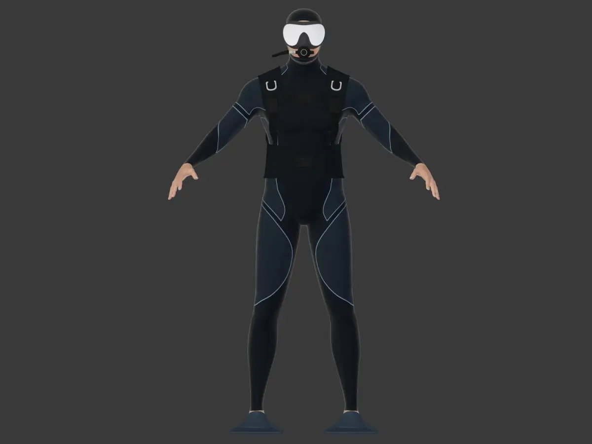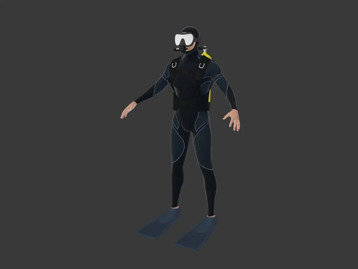 The diver with its suit is UV mapped and textured as well as the eyes, the tongue and the teeth but not the flippers, the vest and the bottle that have only materials