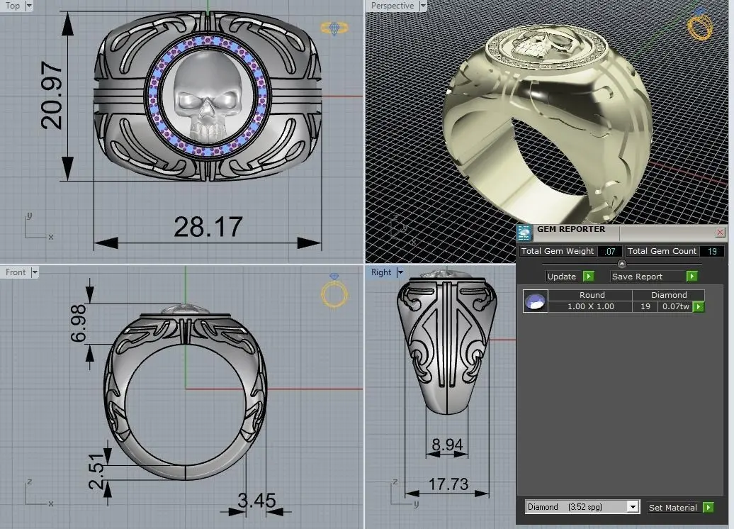 Scull diamond ring 4733D print modelThis model is ready for 3d printing and manufacturing. We can adjust any size, parameters and details as you want.
