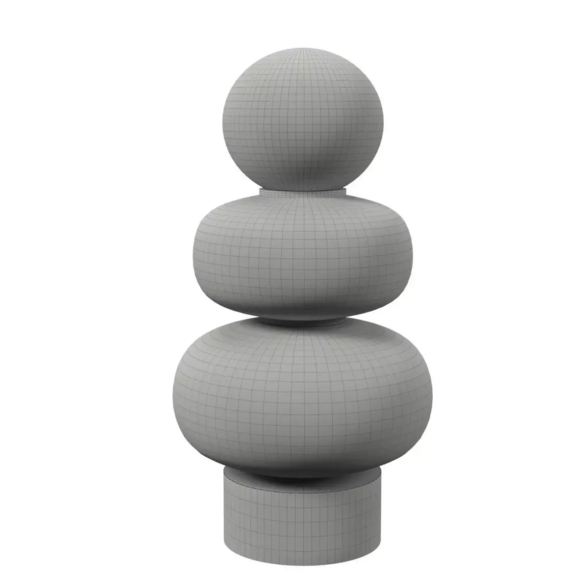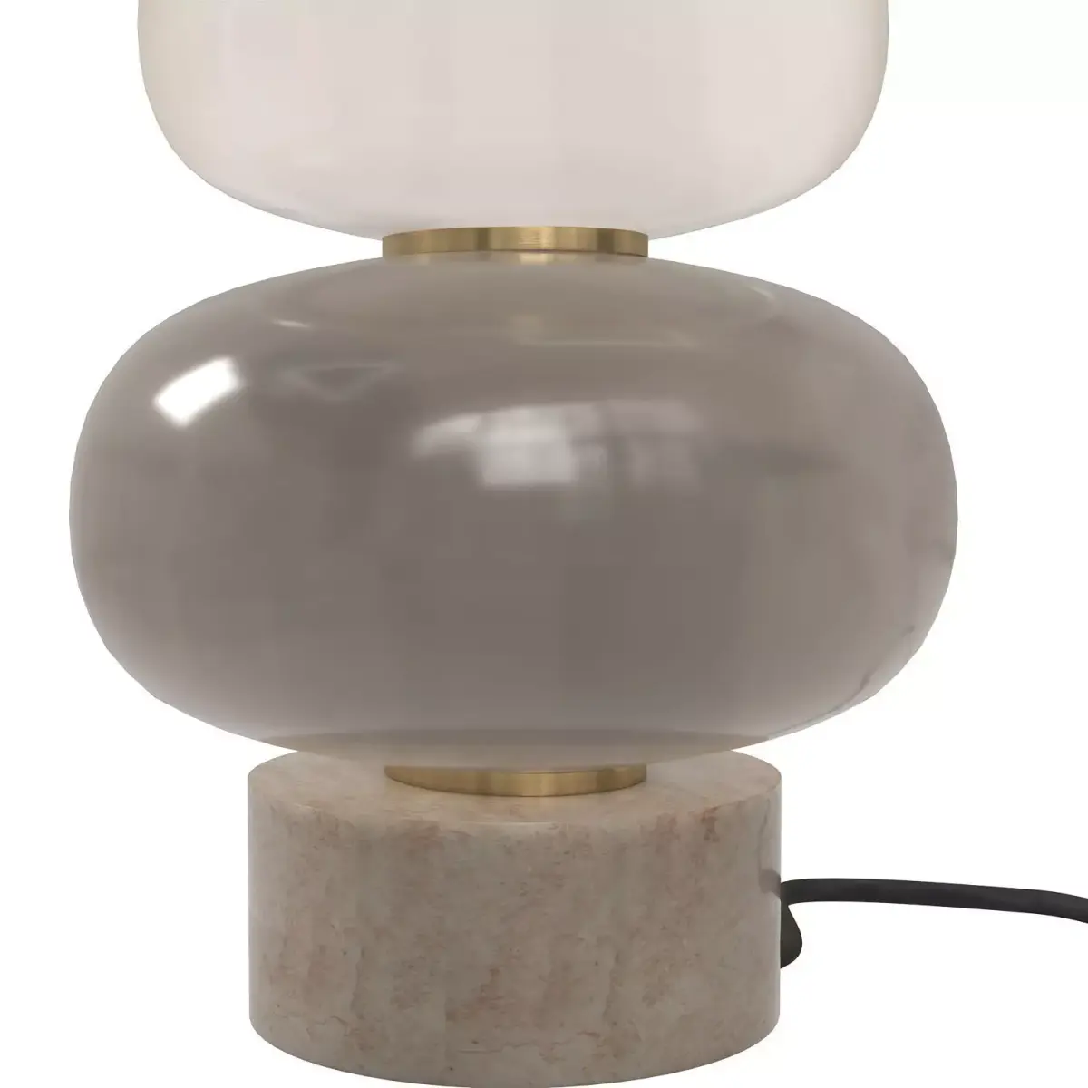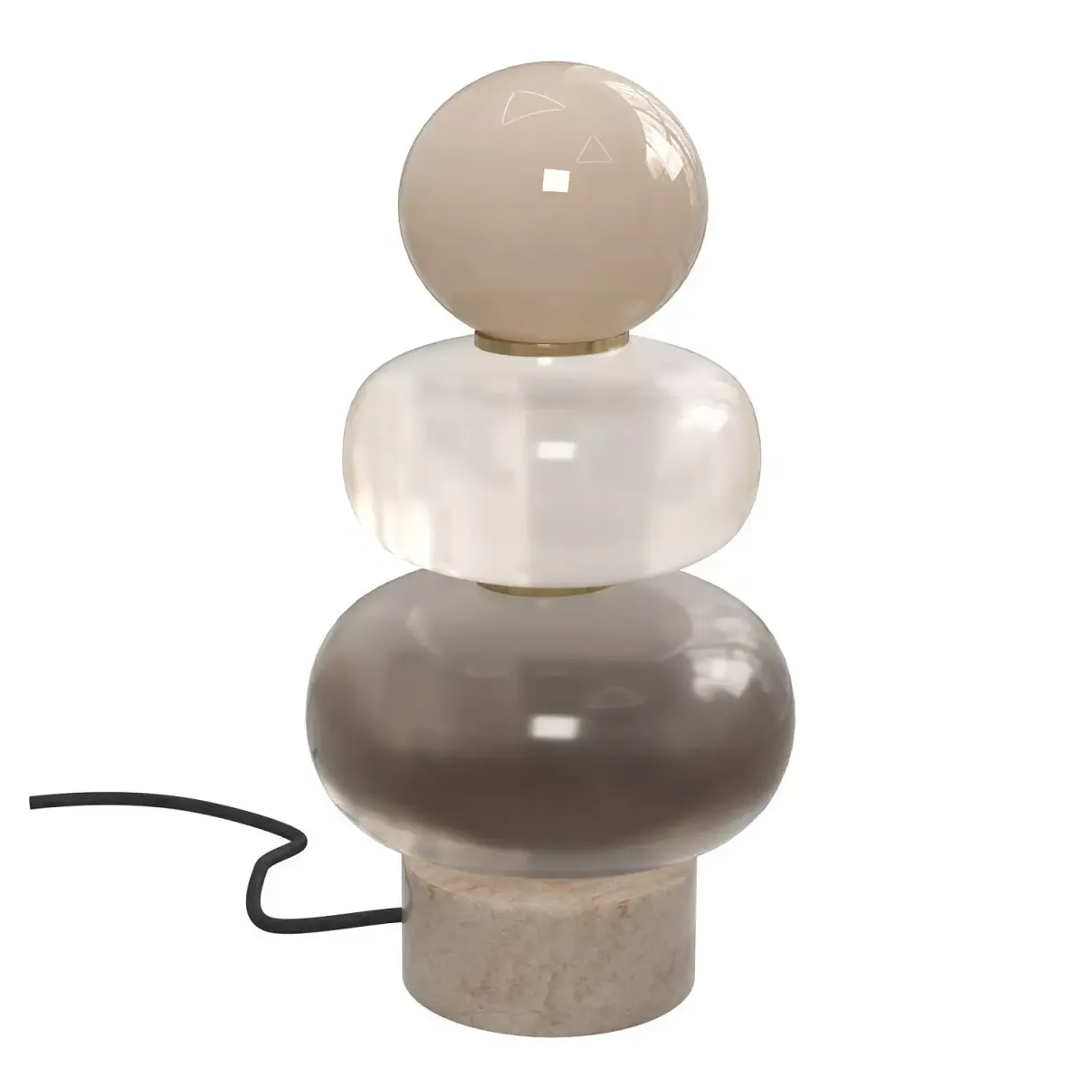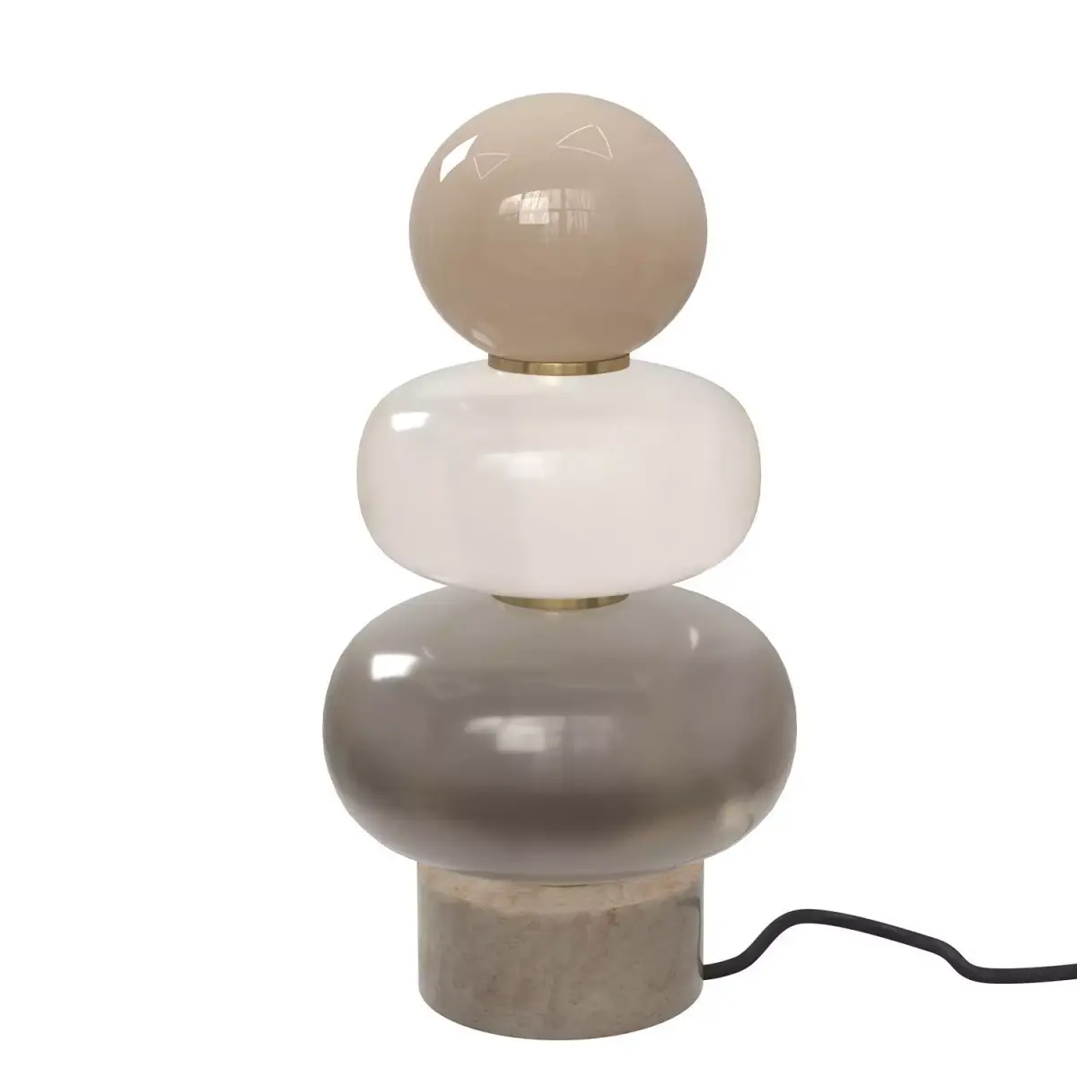 This sculptural table lamp is composed of stacked, rounded glass elements, creating a soft totem-like silhouette inspired by contemporary and Memphis-influenced design. Each glass volume features a distinct translucency and tone, separated by subtle brushed brass rings that bring rhythm and elegance to the composition.