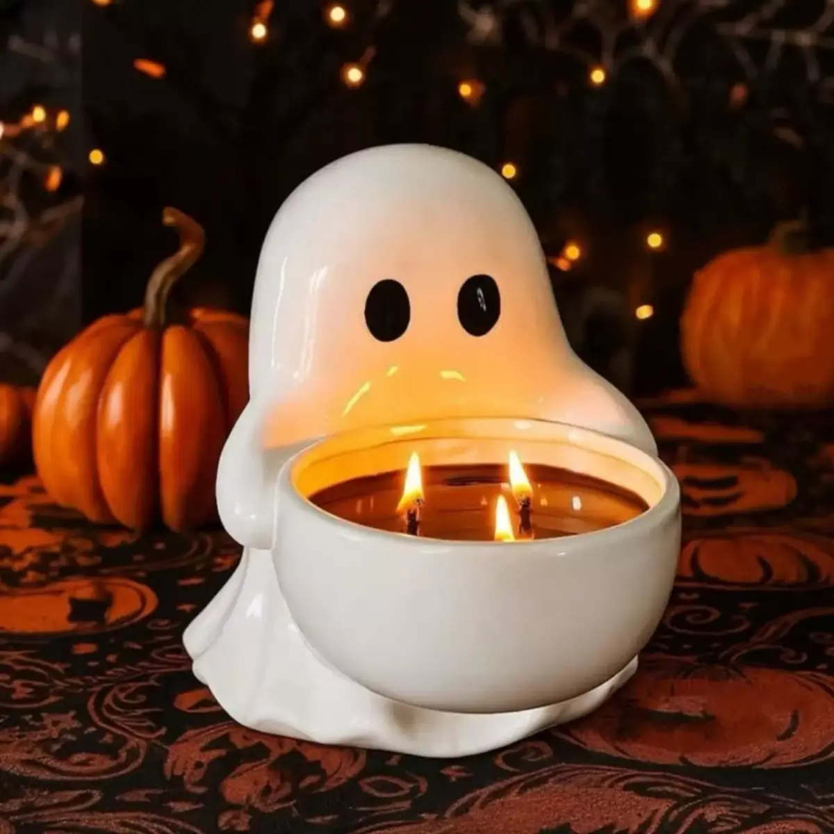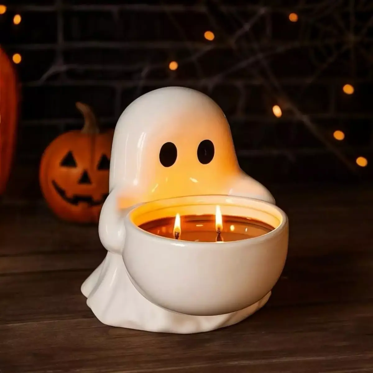 The ghost is designed with soft, flowing shapes that evoke the classic sheet-like form, while its round eyes and subtle expression give it personality. It gently holds a bowl in front of it, perfect for candy, small trinkets, or simply as a decorative detail.