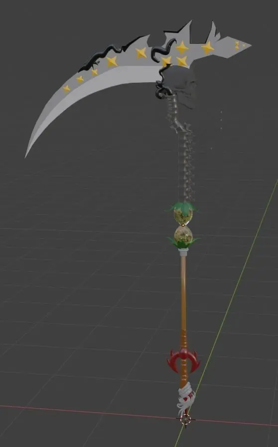 First scythe i made for fun, sat with a drawing on paper and digitalized it and made scythe from scratch with homemade illustrations.It has an hourglass in the middle of it or glass so it looks kinda nice with the leaf interior.