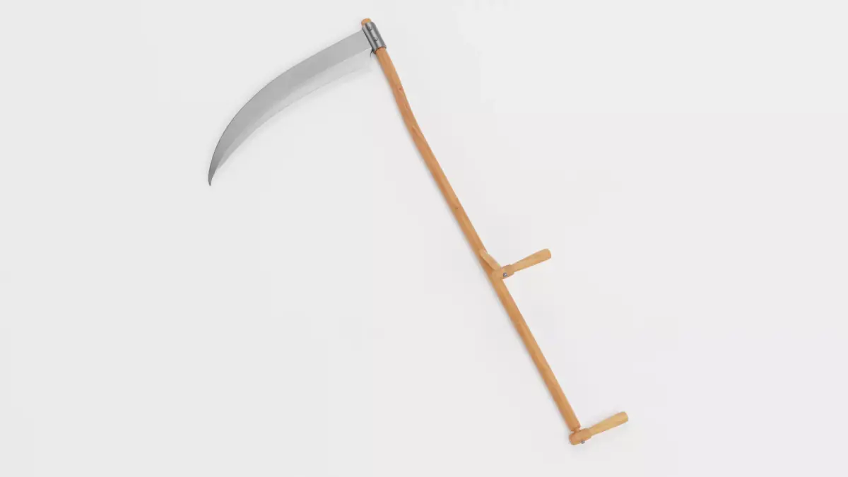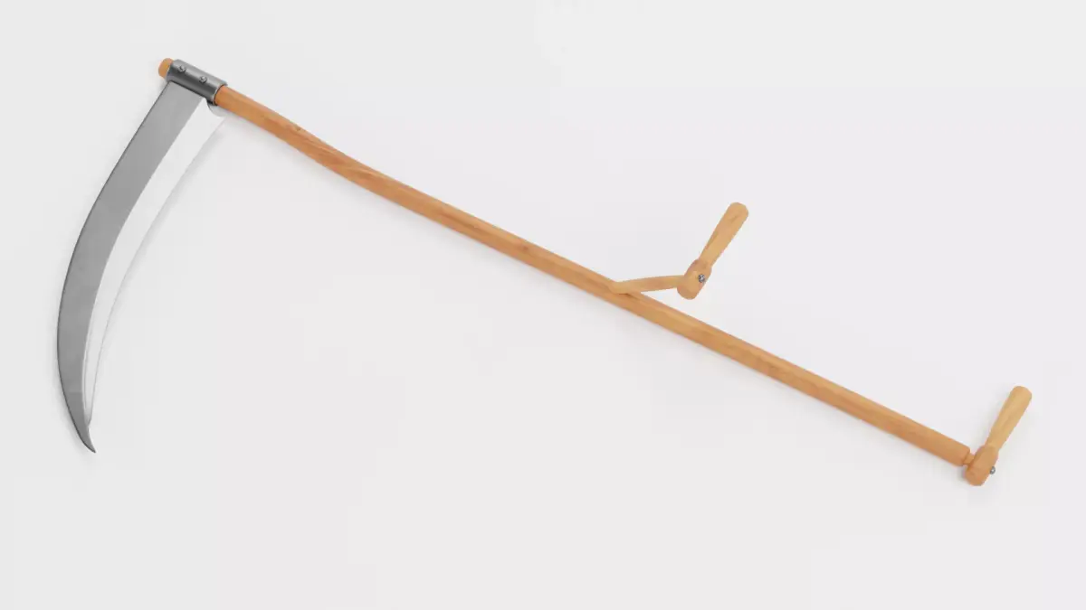 A realistic 3D model of a scythe with dual grips featuring a straight wooden shaft with two support handles. The mesh is clean and fully optimized, ensuring reliable performance in rendering.