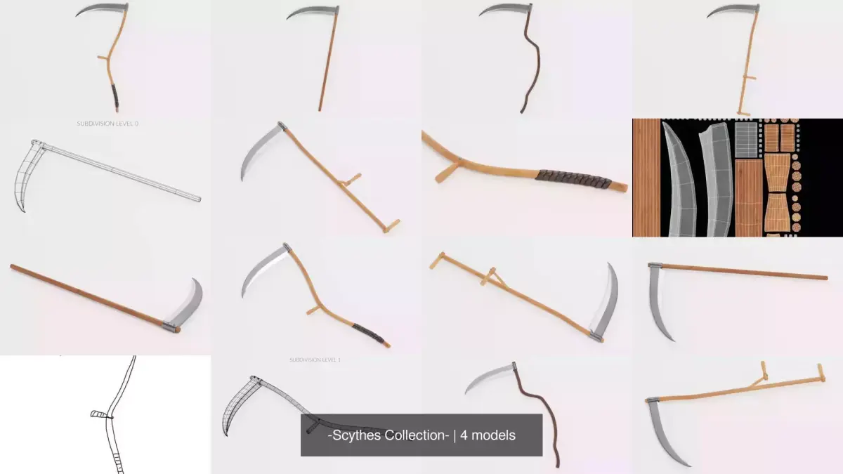 || SPECS ||-This model contains 4 separate objects.-Largest Object (Scythe 01) contains 1,270 polygons and 1,296 vertices with subdivision turned OFF.