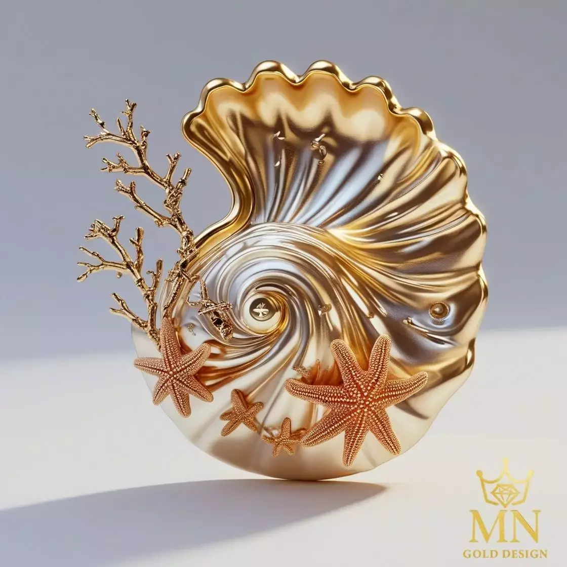 Sea Empress” is a luxurious pair of gold earrings inspired by the mystical beauty of the ocean floor. Featuring a swirling nautilus shell form, adorned with delicate coral branches and rose-gold starfish, these earrings are a tribute to marine elegance and artistic craftsmanship.