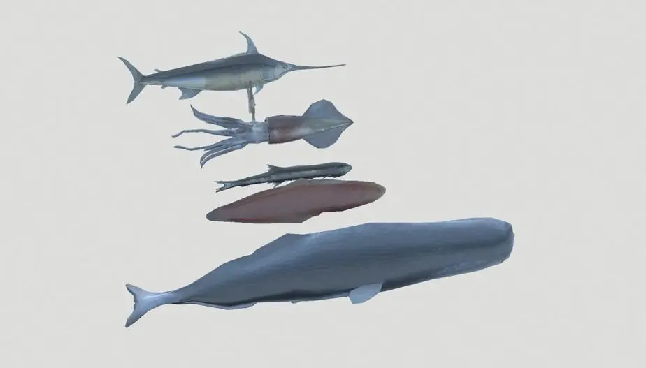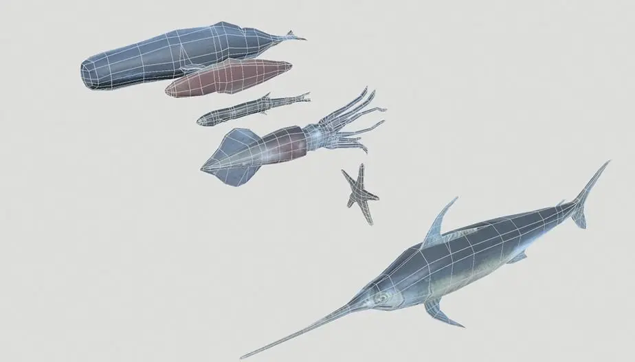 The pack contains six low-poly fish species with photo textures. Species of fish : Swordfish,Star, Sperm whale, Squid,Petrotyx sanguineus, Gonostoma elongatum.