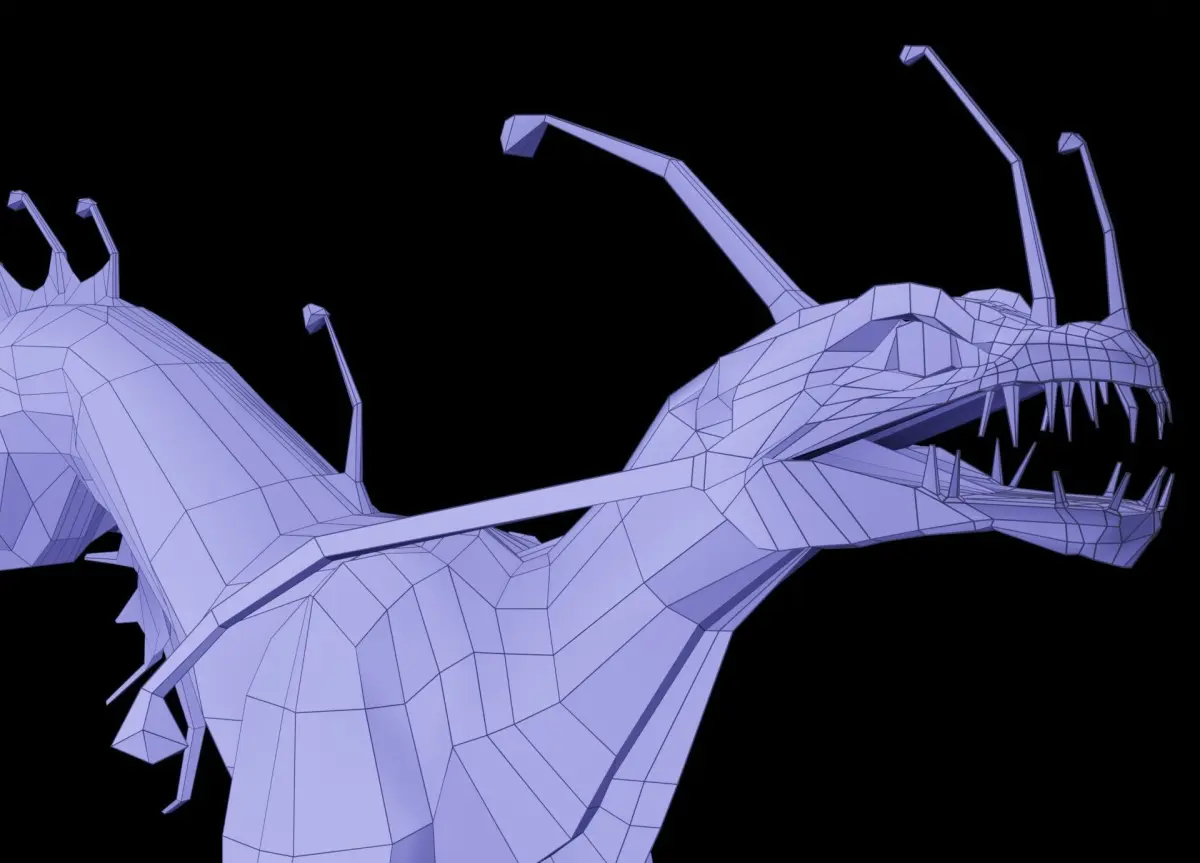 Rigged, lowpoly deep-sea dragon model, available in triangulated and nontriangulated formats. Model file is subdivision ready; textured turntable preview images are of the model with two levels of subdivision applied. Also included in the preview images are the non-subdivided model with visible wireframe. Sculpted in Blender, UV unwrapped. (Also available for purchase in 3D printable formats, prepared for 3D printing with standard 3D printers). Model includes four scale texture maps: displacement, gloss, normal, and reflect.