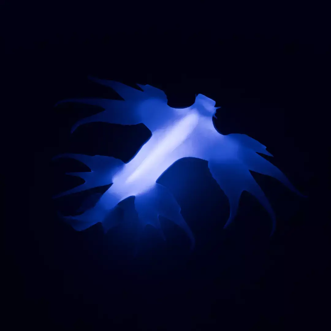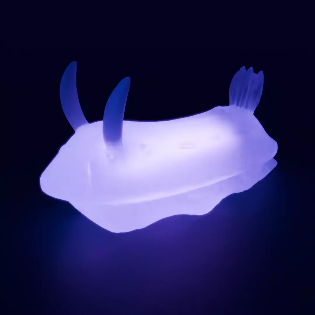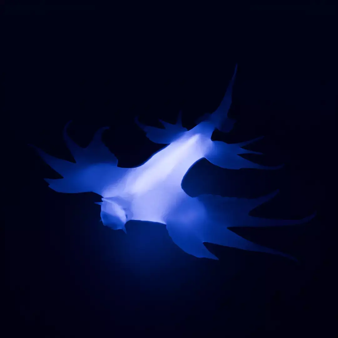This indirect lighting is based on the motif of a nudibranch quietly swaying at the bottom of the sea. The unique shape and soft texture were designed to allow light to spread slowly. The transparency of the material and the delicate curves were carefully modeled in Blender.