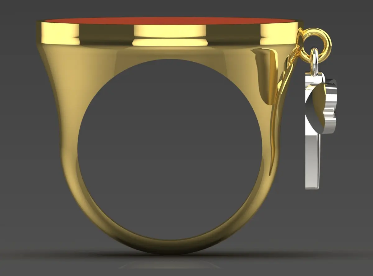 The ring's stirrup, with a strong and polished design of shiny gold, well encloses the gem and the pendant, giving it a luxurious and modern look.