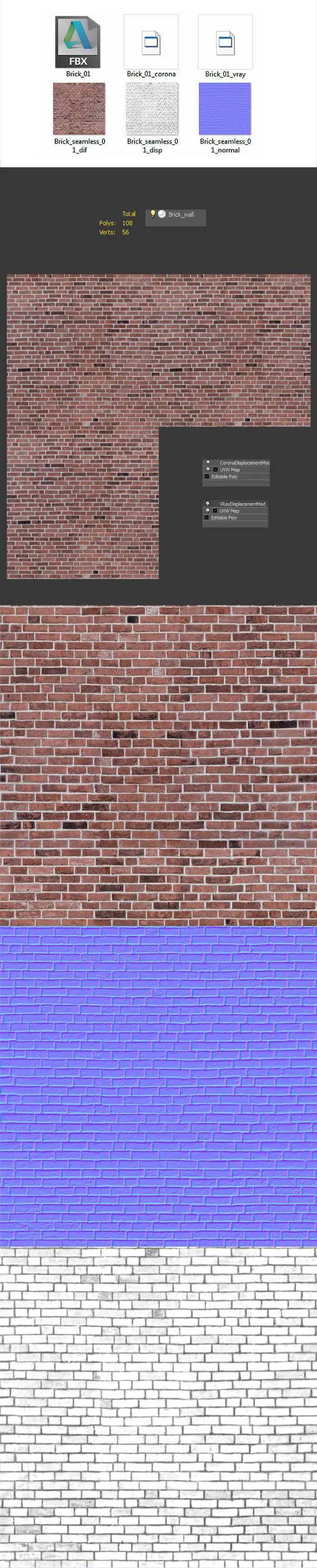 The archive has a 3d wall model with a mapping and displacement modifier, as well as 3 textures: a diffuse map, a normal map and a displacement map