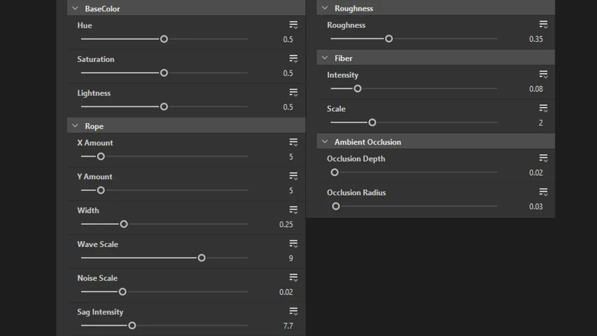 - Rope (X Amount, Y Amount, Width ) Bends in the net (Wave Scale, Noise Scale, Sag Intensity)