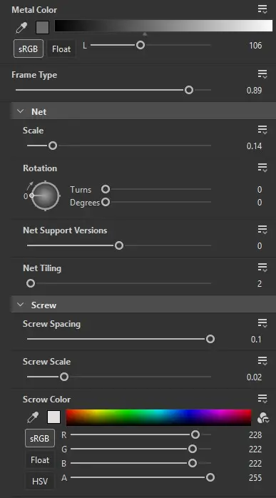 - Screw (Screw Spacing, Screw Scale, Scrow Color)