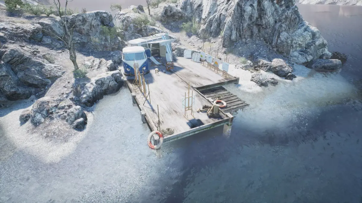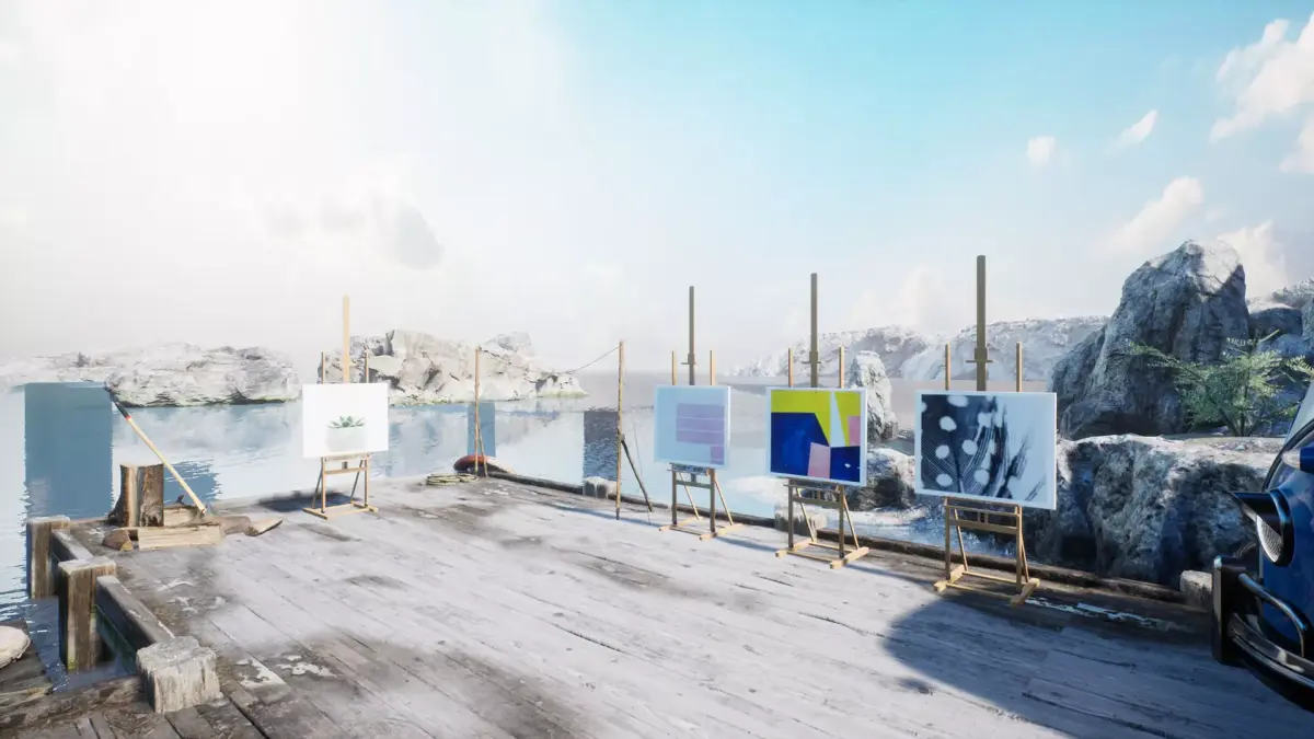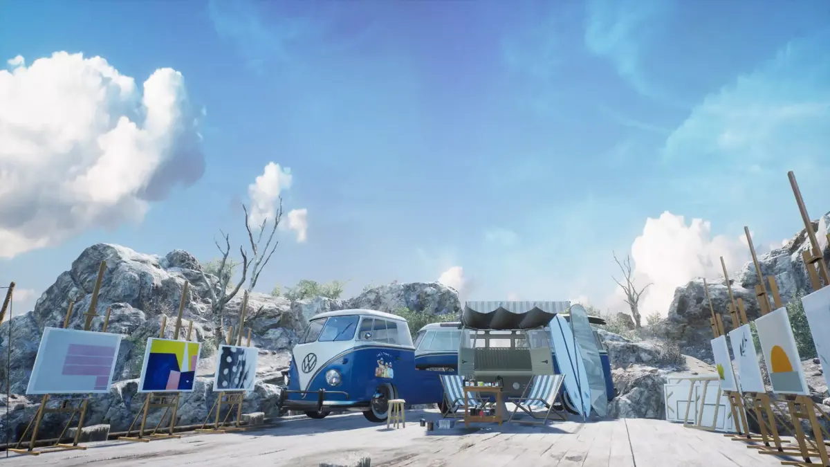 This Unreal Engine 3D environment scene depicts a tranquil seaside artist camp surrounded by rocky cliffs and calm ocean waters.The environment includes vintage camper vans, surfboards, painting easels, wooden docks, chairs, and various coastal props to create a warm and creative outdoor atmosphere.