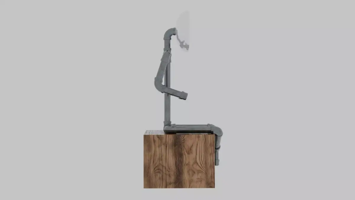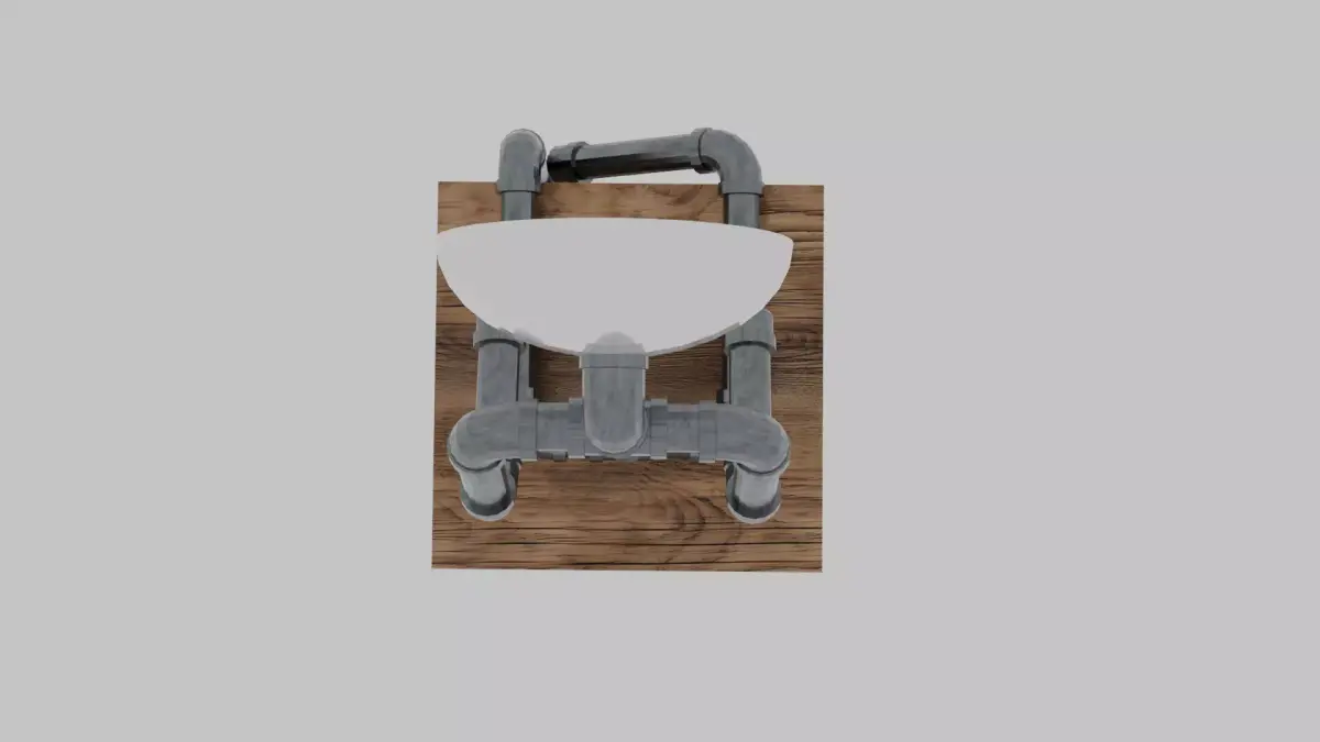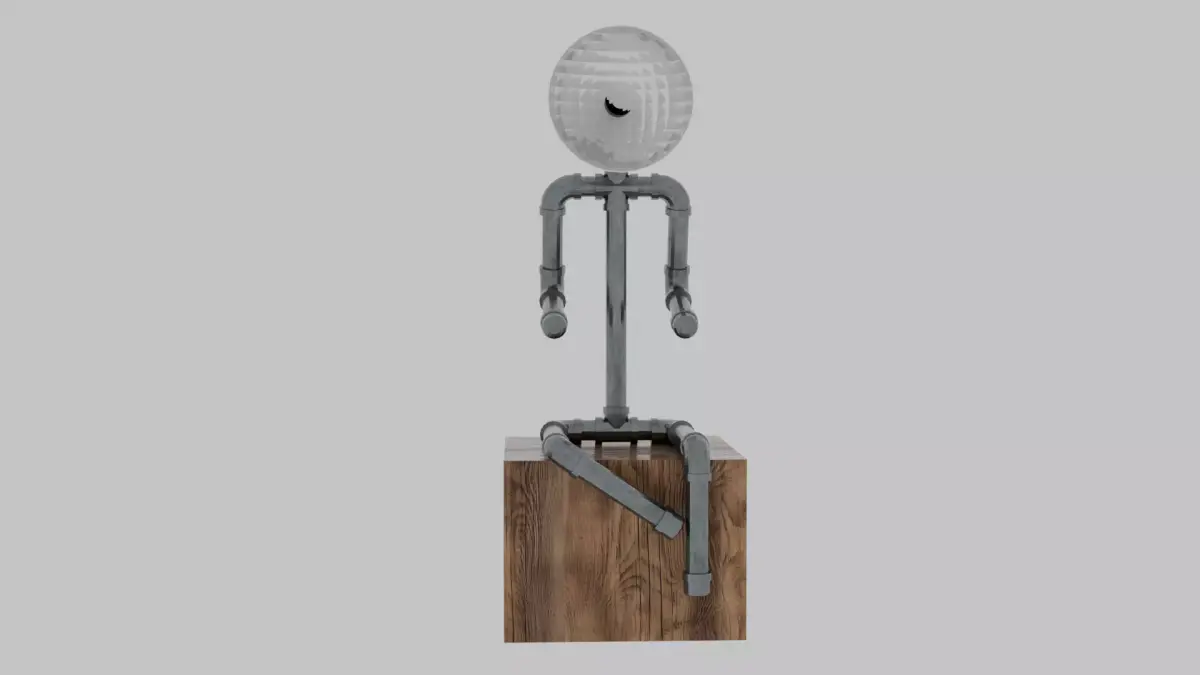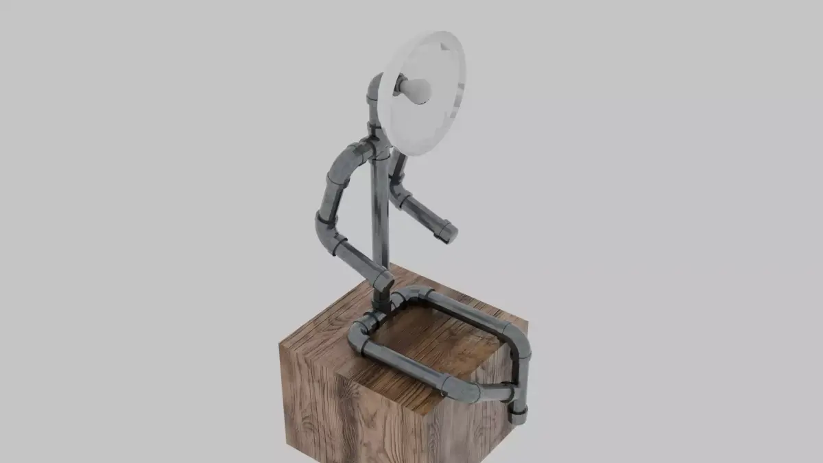 This seated man pipe fitting lamp is a whimsical industrial-style figure built entirely from metal pipes and pipe fittings, assembled to resemble a relaxed seated man. The character sits casually with one leg crossed, giving him a laid-back, almost sculptural personality. His head is formed from a shiny chrome reflector, housing a central bulb. The pipes are modeled in bare metal, showing off their raw, mechanical texture and giving the lamp a rugged, handcrafted feel.