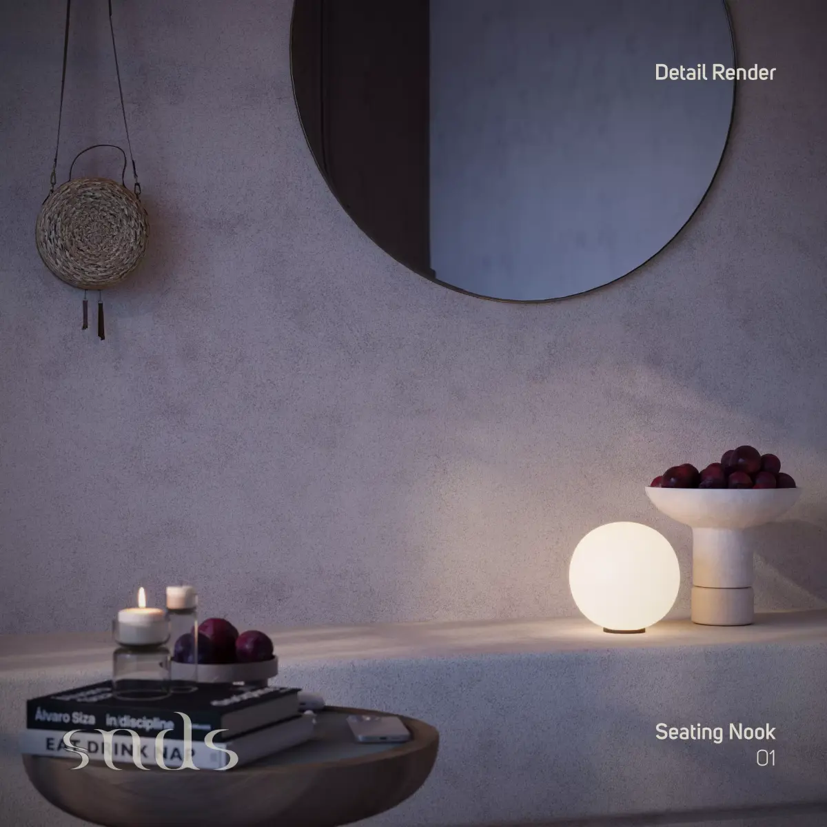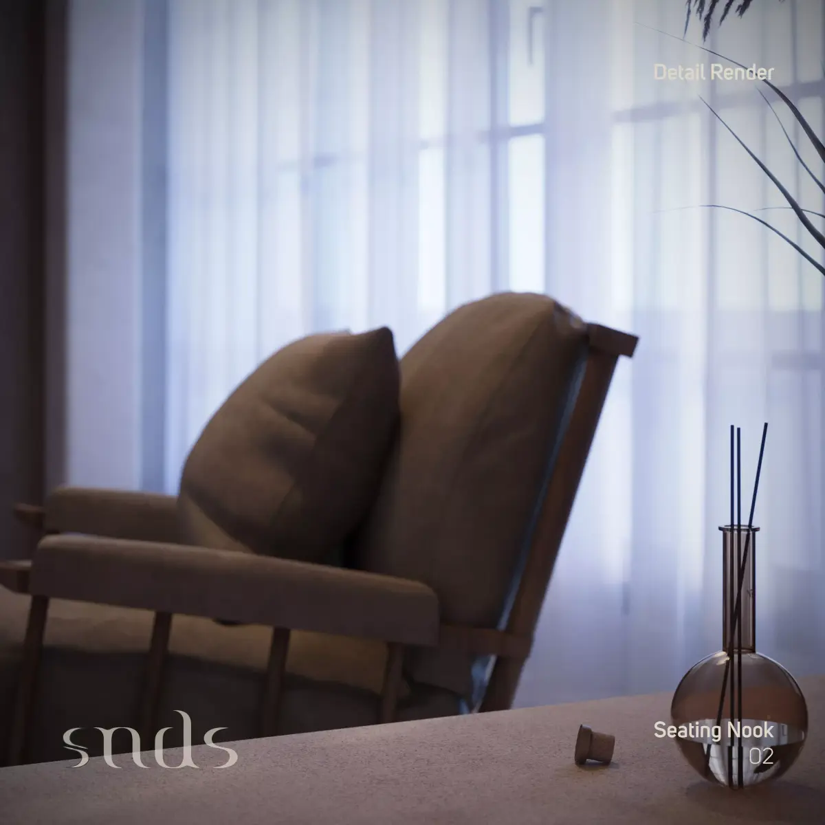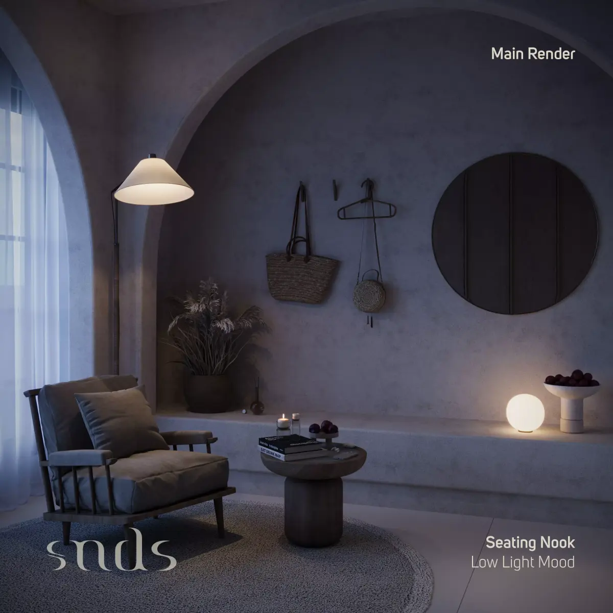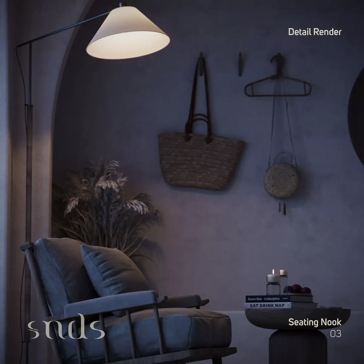 Seating Nook is a warm and calming interior scene designed to highlight a cozy corner with soft architectural lines and natural textures.The scene includes two main renders:Full Light Mood.Low Light Mood.Additionally, a set of Detail Renders captures the fine elements of the scene.