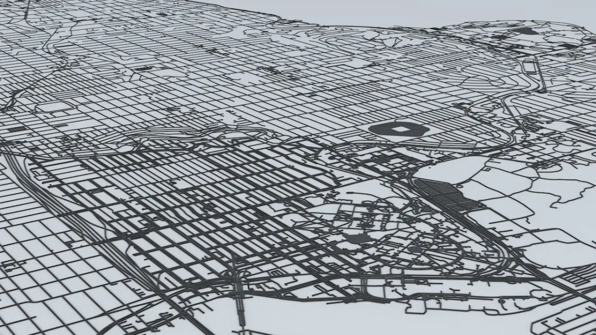 - the model is positioned on a flat surface (road network is on the “floor” - no elevation data included)