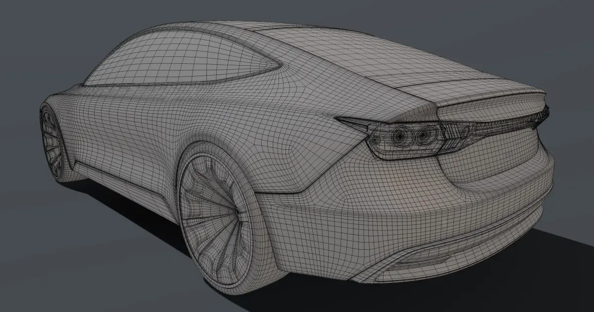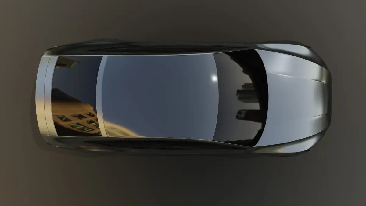 A sleek, futuristic sedan car with a metallic silver exterior, featuring angular lines and LED lights that give it a high-tech look. The car sits low to the ground on black alloy wheels, with tinted windows adding to its modern aesthetic. The interior is minimalist yet luxurious, with white leather seats and a large touchscreen display in the center console.