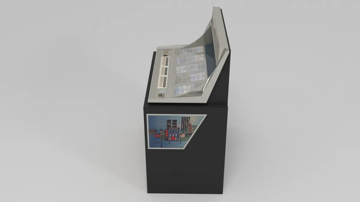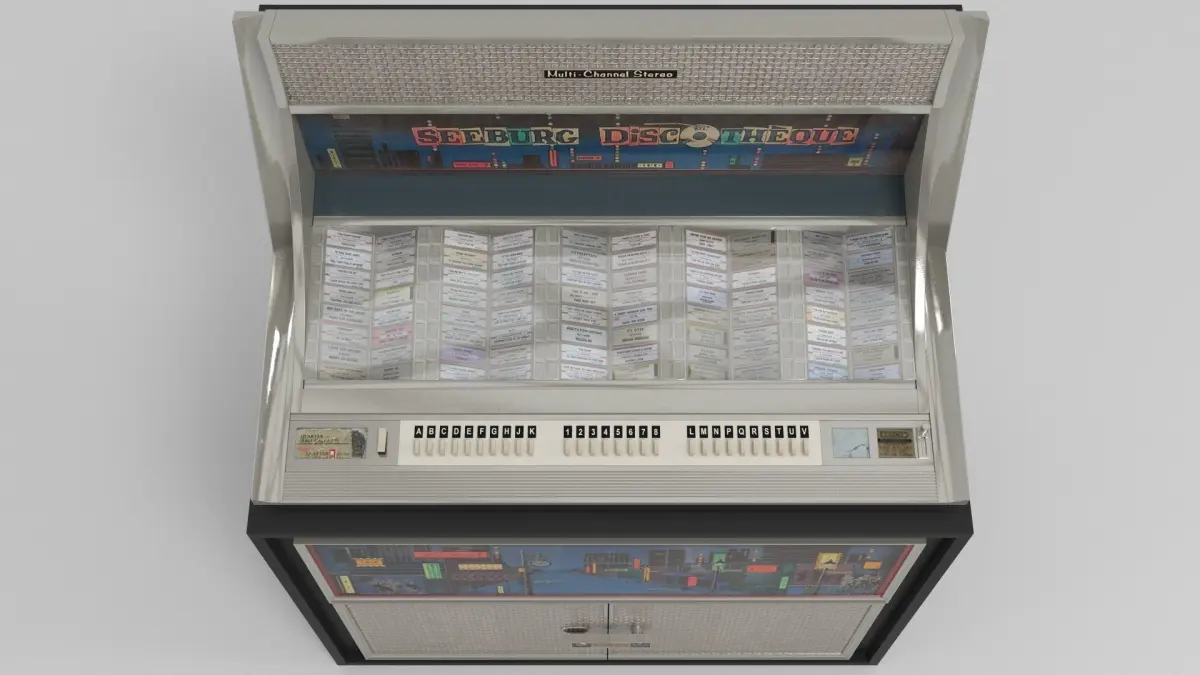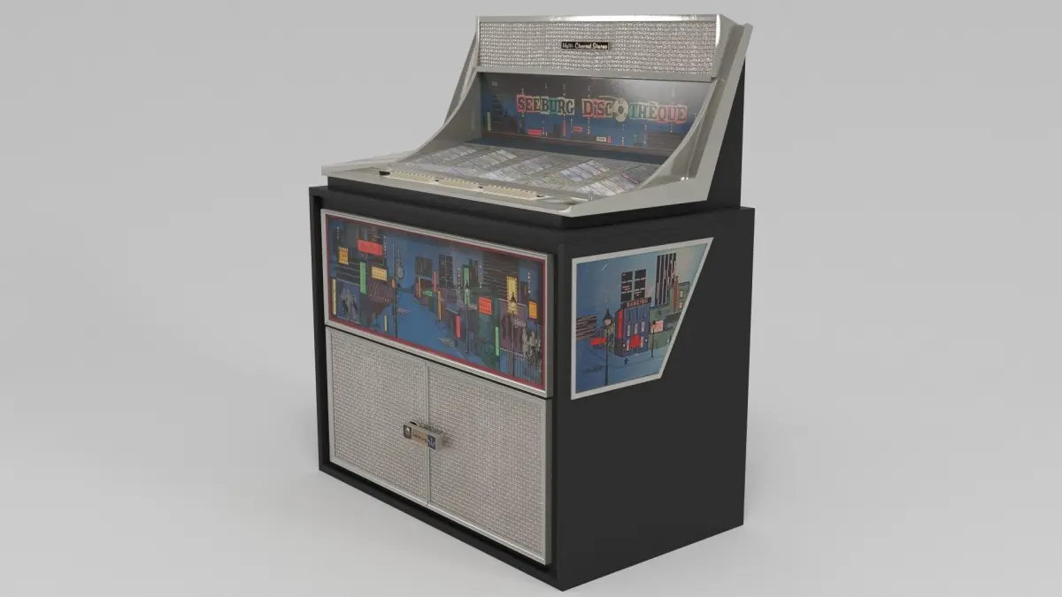 Seeburg Discotheque Jukebox 196554 625 TrisThis model was only built from Aug. 1965 to July 1966 and they made only 8000. People didn't recognize the record picture as the O in disco, so it was called Disc The Que, therefore the limited production. Nice vintage look with an interesting story.V-Ray render and materials