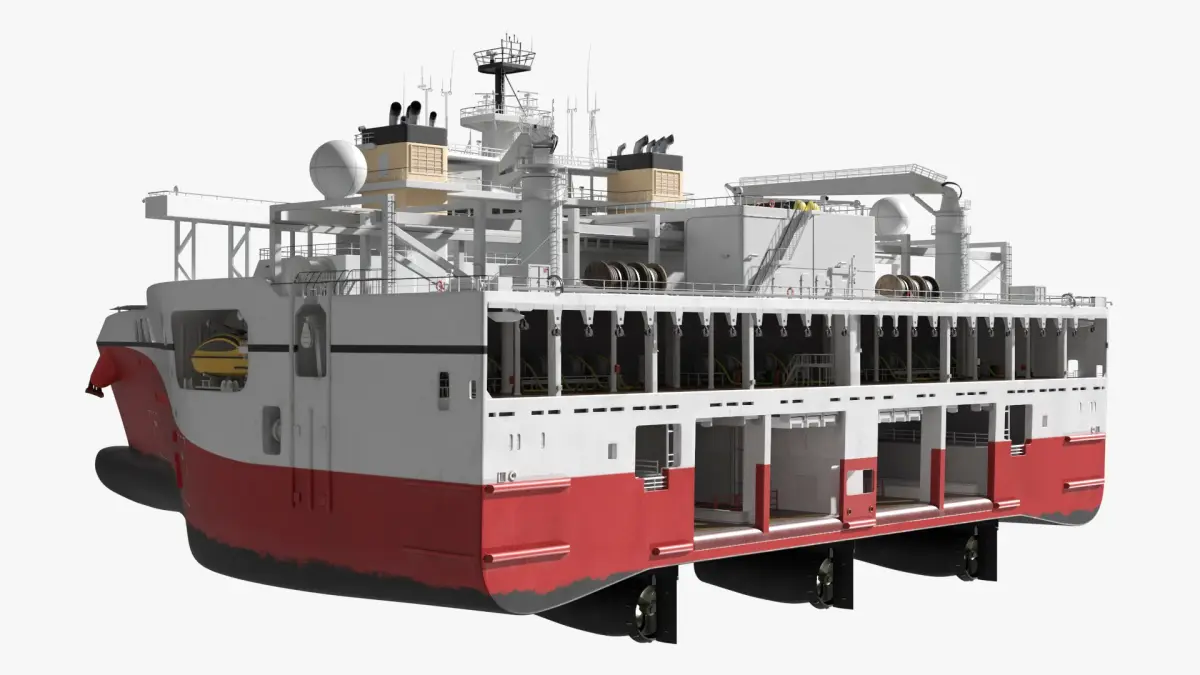 This model features a robust hull designed to break through ice, a spacious deck for research equipment, and state-of-the-art navigation systems. The vessel is equipped with facilities for scientific research, making it ideal for polar expeditions. Its design includes multiple levels for crew and equipment, with specialized areas for data analysis and sample storage.