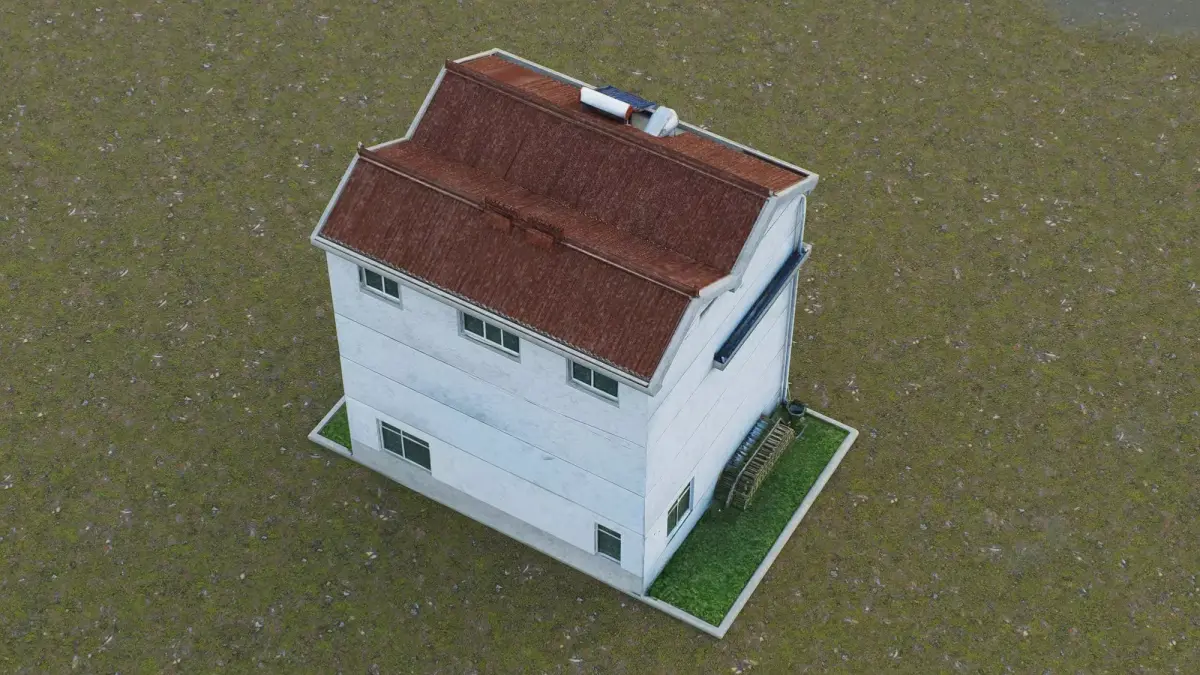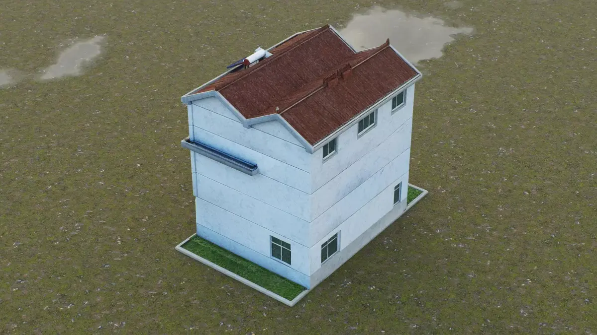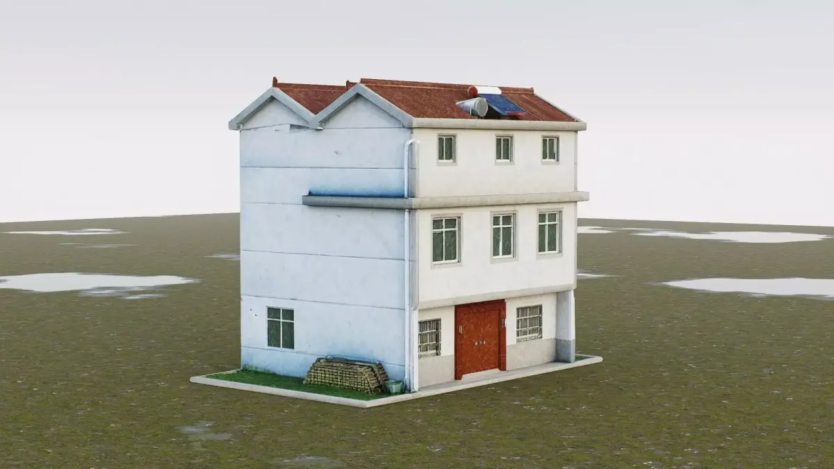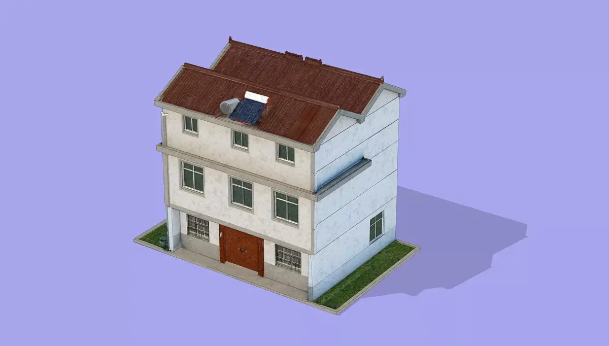 This 3D low-poly model depicts a modern self-built rural house in China, representing the widespread trend of individual homeownership and construction in contemporary Chinese countryside. The two-story structure features a combination of traditional and modern architectural elements, with a sloped red-tiled roof typical of regional design, paired with clean, white exterior walls and functional window layouts. A solar water heater installed on the roof highlights the integration of renewable energy in rural living. The building includes a ground-level entrance with a wooden door, barred windows for security, and a small landscaped front yard. Designed with optimized geometry for real-time applications, this model accurately captures the essence of post-2000s Chinese rural residential architecture—practical, modest, and increasingly influenced by urban design trends.