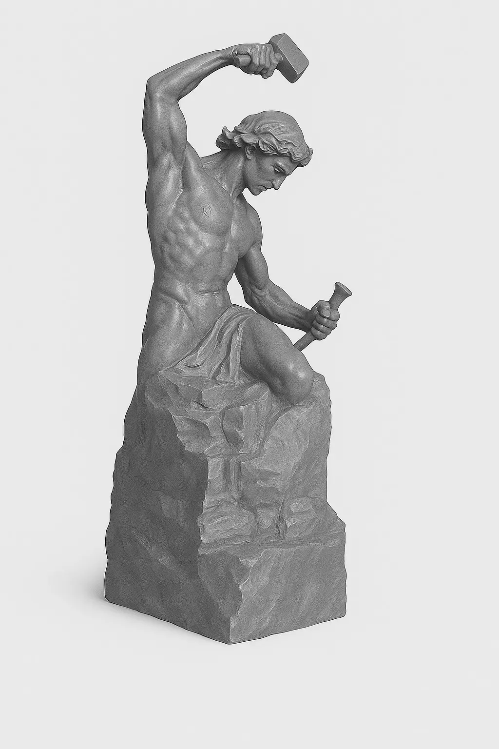 This AI-generated artwork symbolizes the human spirit shaping itself out of raw stone — a metaphor of transformation, strength, and self-determination. The model portrays a muscular figure emerging from a rocky block, holding a hammer and chisel, sculpting his own form.