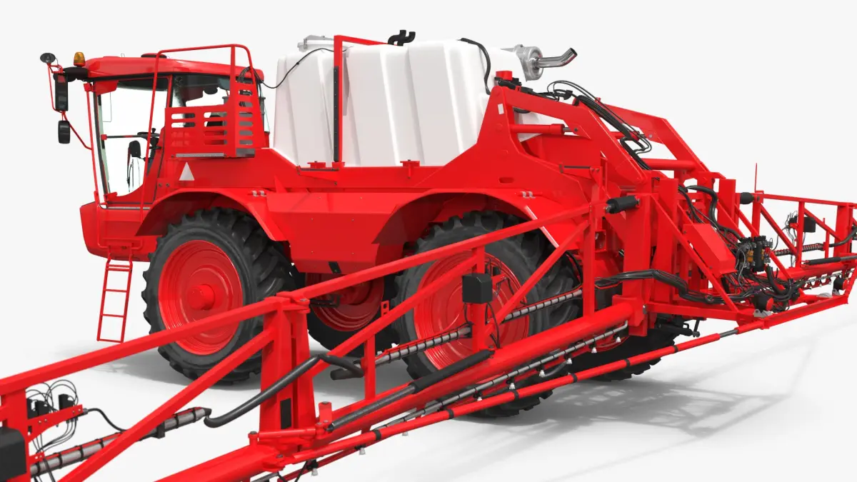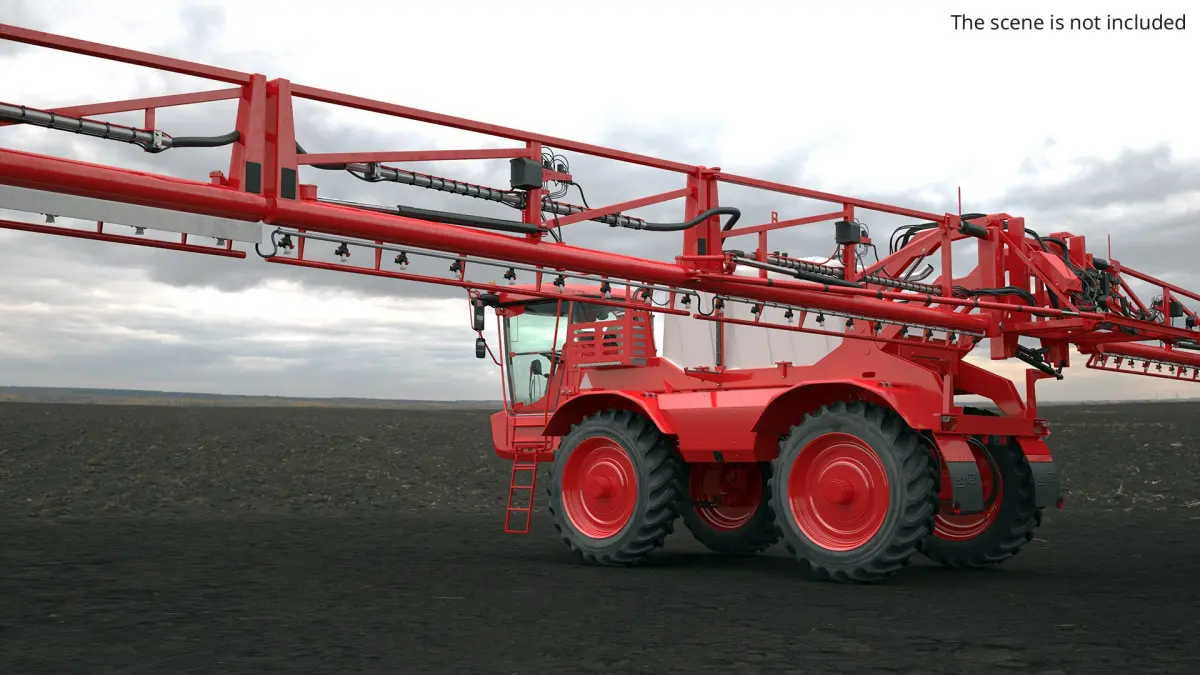 Self Propelled Crop Sprayer with Telescopic Boom Red is a 3d model of an advanced farm vehicle designed for efficient and precise crop spraying.