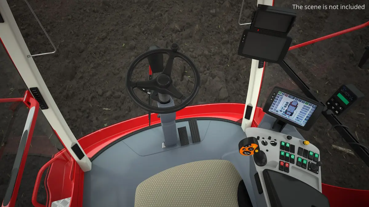 This model showcases a high-tech agricultural machine equipped with multiple spray nozzles and a spacious cockpit for operator comfort. The robust red frame supports a large tank and a sophisticated hydraulic system for even distribution of liquids. Its elevated structure enhances maneuverability through various terrains, making it ideal for large-scale farming operations.