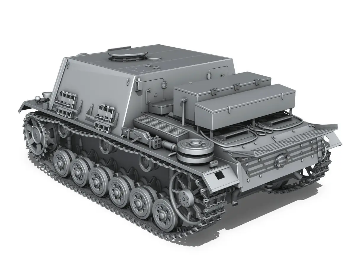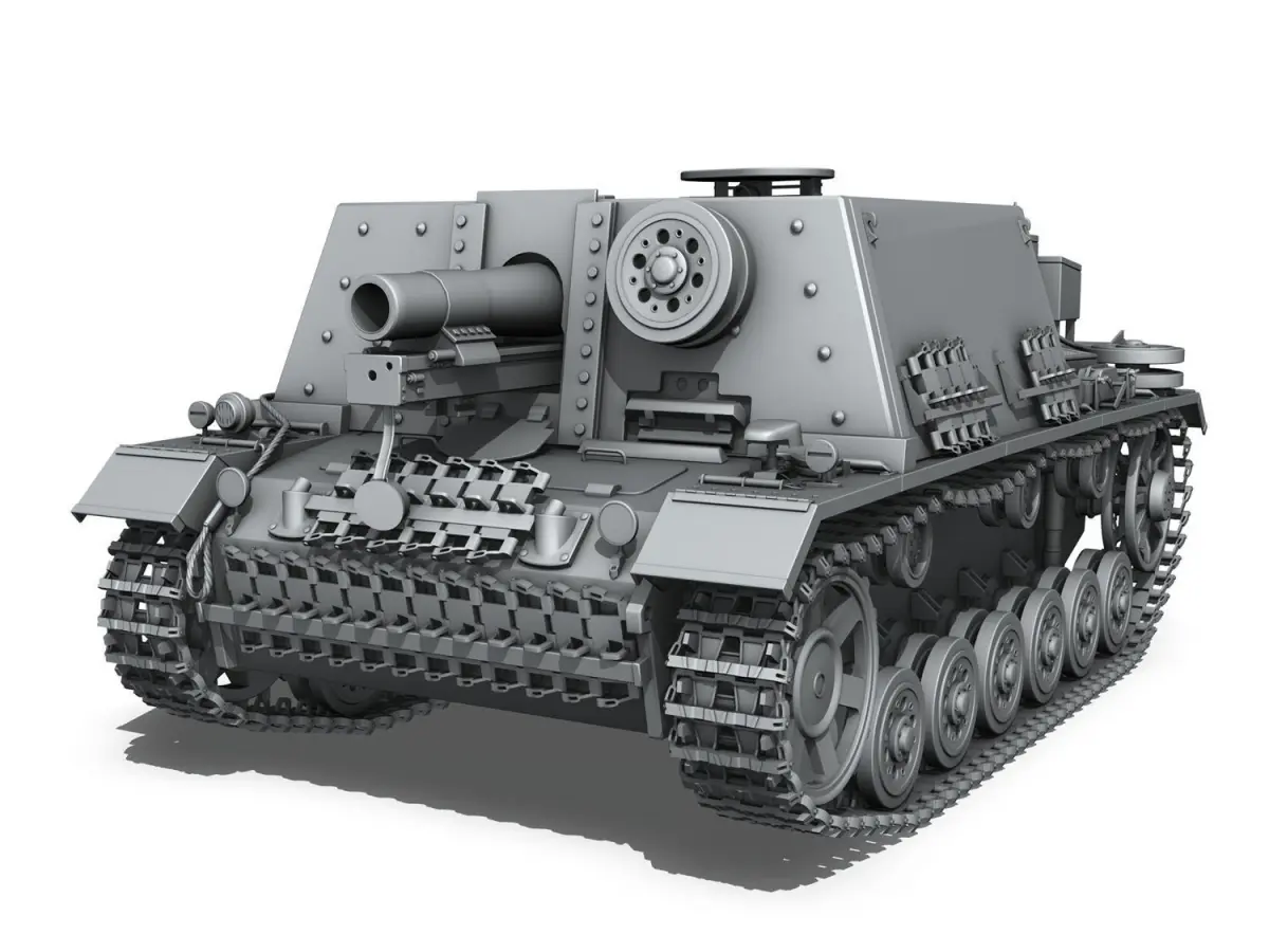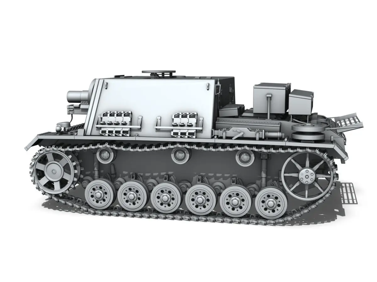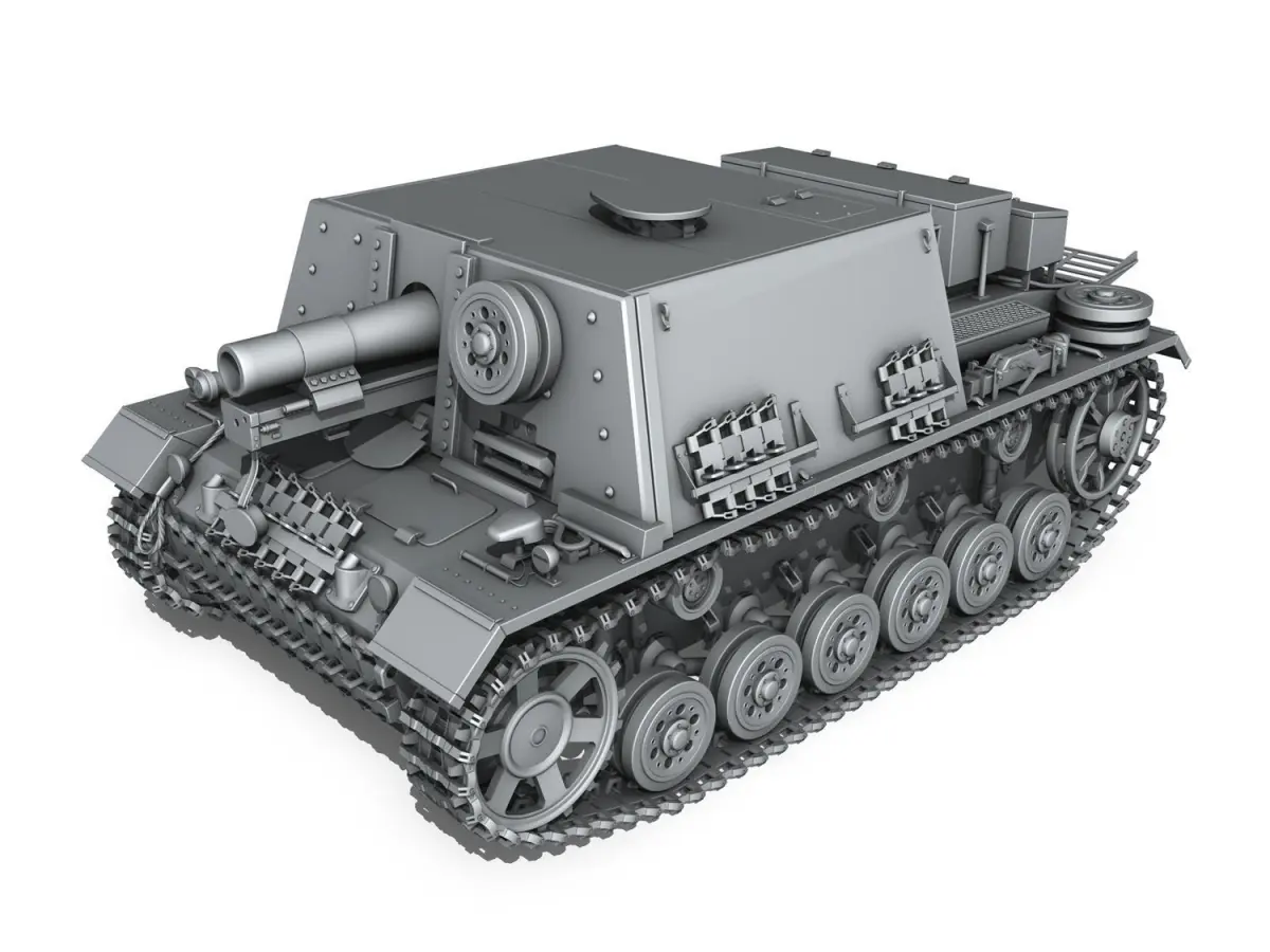 The Sturminfanteriefeschutz 33B (StuIG 33B) was a German assult infantry gun of the WW2. The StuIG 33B was based upon a Panzer 3 chassis, with the turret removed and mounted with a 150 mm StuIG L/11 gun and an 7.92 mm MG34 machine-gun. The StuIG 33B was manned by a crew of five and powered by a Maybach HL120TRM engine providing a top speed of 20 kmh and a range of 110 km.