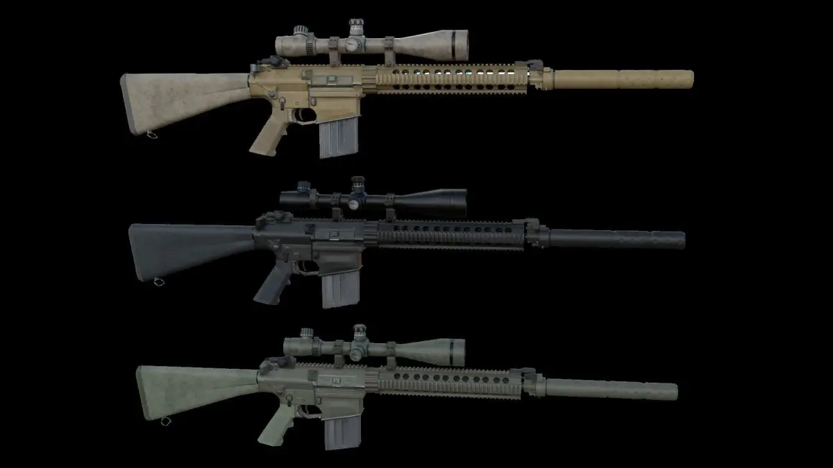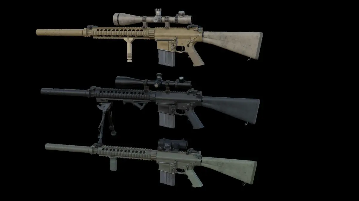 -Sniper Rifle: 7 parts for ease of animation (Chassis; mag; charging handle; bolt; dust cover; front iron sight; rear iron sight); 4K or 2K textures to choose from; black, tan and muddy green; Iron sights have their own seperate 1K texture pack; 13 398 tris; 7 379 verts.