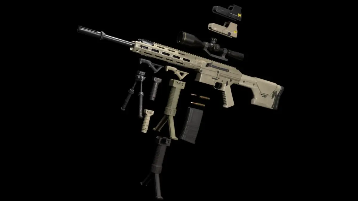 - Sniper rifle; 4 seperate parts for ease of animation (body; mag; charging handle; bolt); has both 4K and 2K textures; black and tan; 11 434 tris, 6 060 verts.