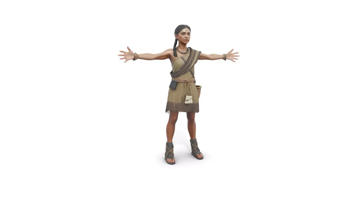 Includes multiple idle, walk, run, and jump animations as FBX files for Unity and Unreal Engine, easy to apply to this character. It's full compatible with Mixamo RIG.This character model comes in 3 levels of detail: low-poly for mobile games, mid-poly for standard games, and high-poly for cinematics. The model is fully rigged and ready for animation. It includes PBR textures (4096x4096), including diffuse, normal maps, and metallic/roughness maps. The character is provided in T-pose and can be easily imported into any modern game engine or 3D software. Perfect for games, animations, or virtual reality applications. Please like and comment if you find this model useful!semi-realistic game character, realistic textures, high detail: a wiry prehistoric gatherer woman with sturdy legs and a compact silhouette, weathered olive skin with sun freckles, calm sharp eyes, and a single braided hairstyle wrapped around the head; wearing layered plant-fiber shawl over a patched hide vest, cord belt, simple bead necklace, wrapped calves, and worn moccasins with mud stains; a woven foraging basket strapped to her back and a smaller plaited satchel clipped to the belt, plus a bone needle case attached to the strap. In a forest-edge clearing with damp leaf litter, mossy rocks, and fallen birch branches under cool misty morning light; “Full-body, centered, fully visible in frame; standing upright in a T-pose with arms extended straight out to the sides; palms facing the camera (open palms); hands empty; match the provided OpenPose reference; PBR-friendly materials.”.