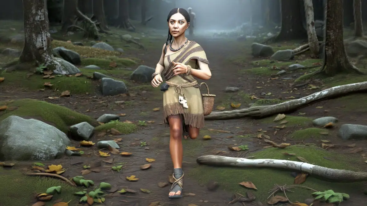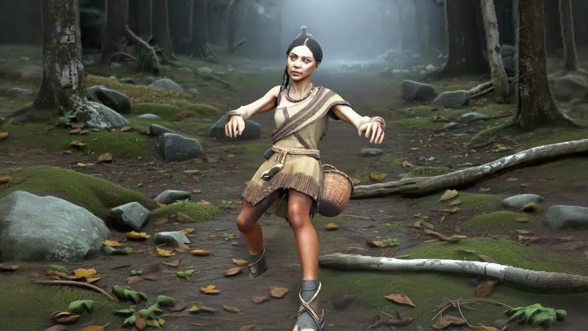 semi-realistic game character, realistic textures, high detail: a wiry prehistoric gatherer woman with sturdy legs and a compact silhouette, weathered olive skin with sun freckles, calm sharp eyes, and a single braided hairstyle wrapped around the head; wearing layered plant-fiber shawl over a patched hide vest, cord belt, simple bead necklace, wrapped calves, and worn moccasins with mud stains; a woven foraging basket strapped to her back and a smaller plaited satchel clipped to the belt, plus a bone needle case attached to the strap. In a forest-edge clearing with damp leaf litter, mossy rocks, and fallen birch branches under cool misty morning light; “Full-body, centered, fully visible in frame; standing upright in a T-pose with arms extended straight out to the sides; palms facing the camera (open palms); hands empty; match the provided OpenPose reference; PBR-friendly materials.”.