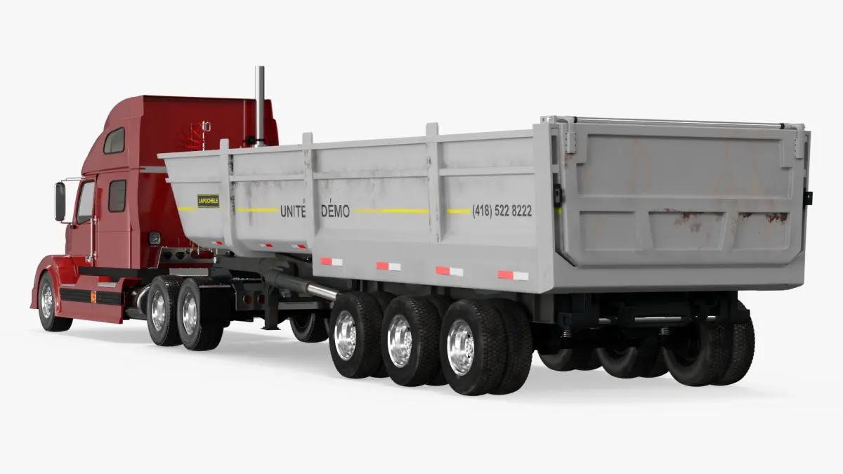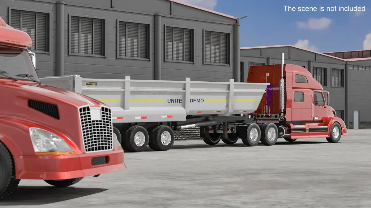 Semi Truck with Dump Trailer is a three-dimensional model of red freight truck with trailer, that is a powerful semi-truck paired with a large-capacity trailer, used for transporting goods across long distances.