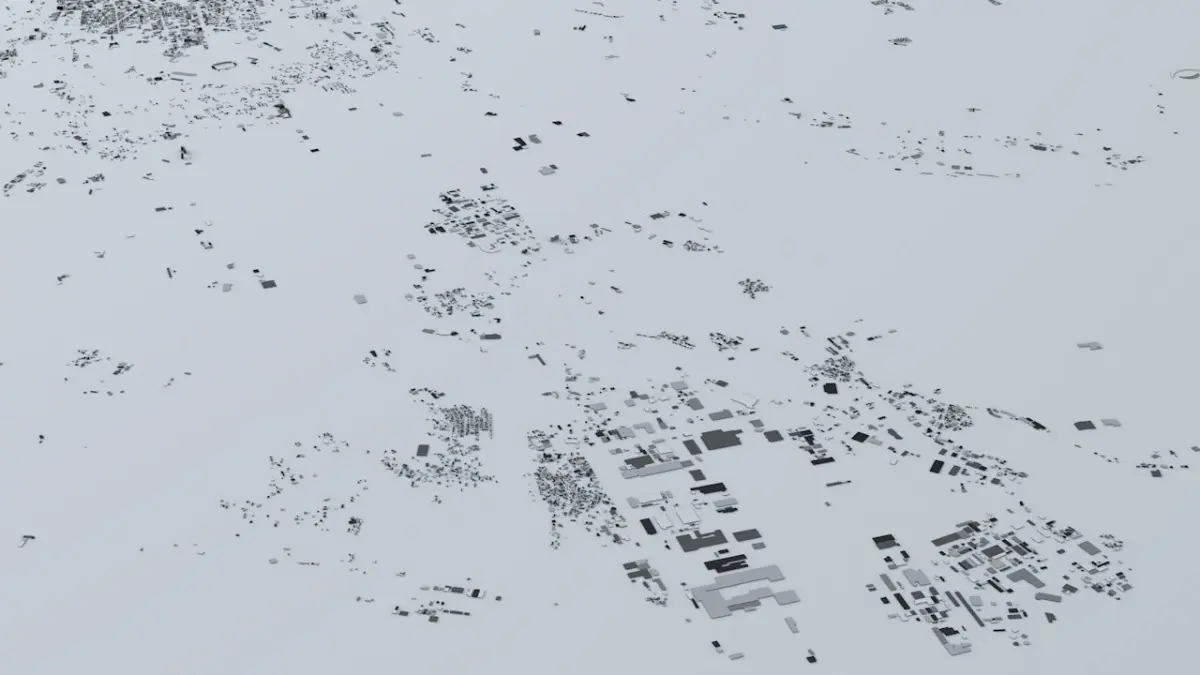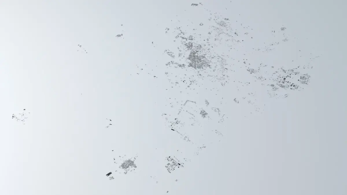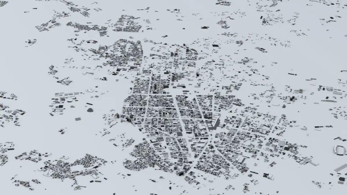 - the model is positioned on a flat surface (all buildings are on the “floor” - no elevation data included)