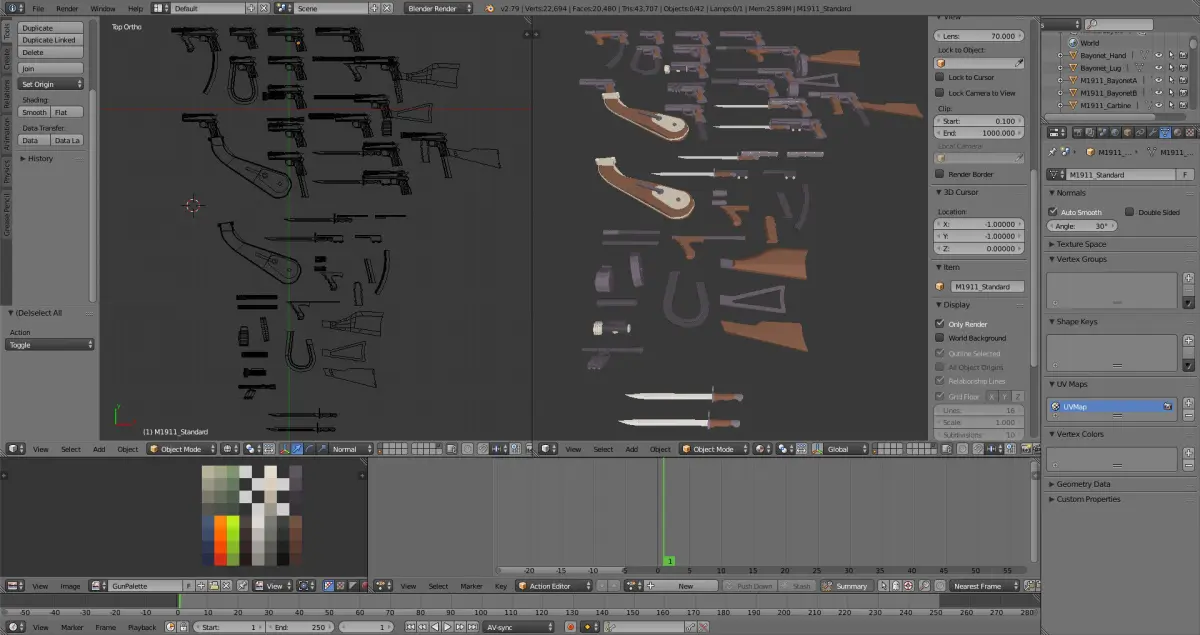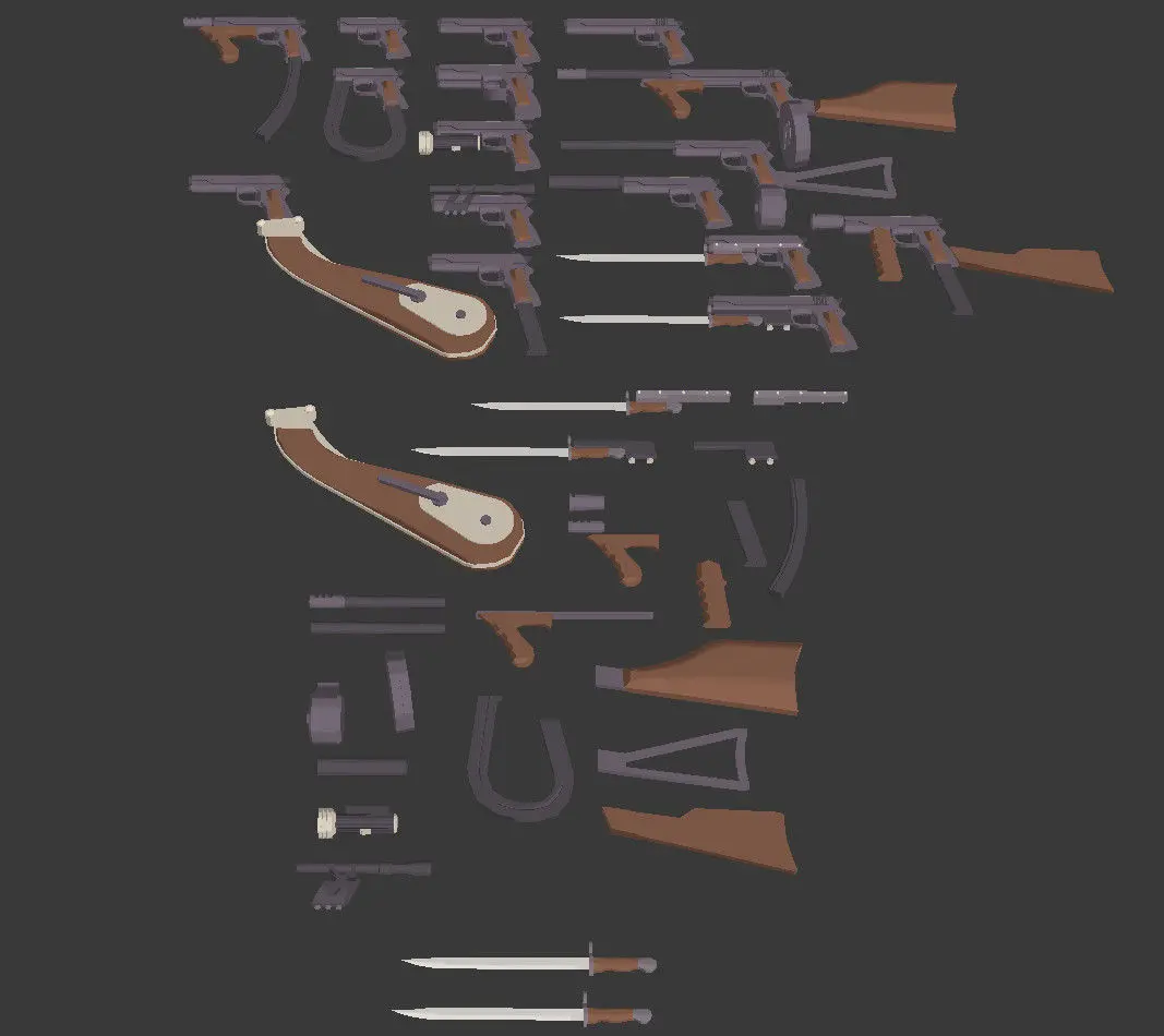 The Sentinel Series offers a range of firearms from around 100 years ago, WWI, Prohibition, Great Depression, etc. Each gun model has a mix of accessories that are historically real, purely silly or both. Game or ready, though I expect you to modify them a bit to build yourself the perfect weapon for your perfect project. Reasonably low poly, as I am unpleased with how blocky the super low poly firearms tend to look.