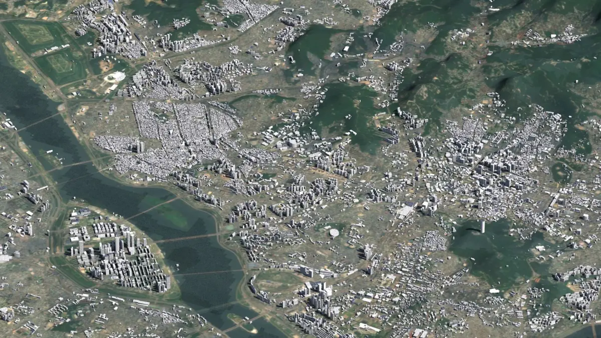 Includes 3D buildings when available. Buildings are not textured and often simple cubes.